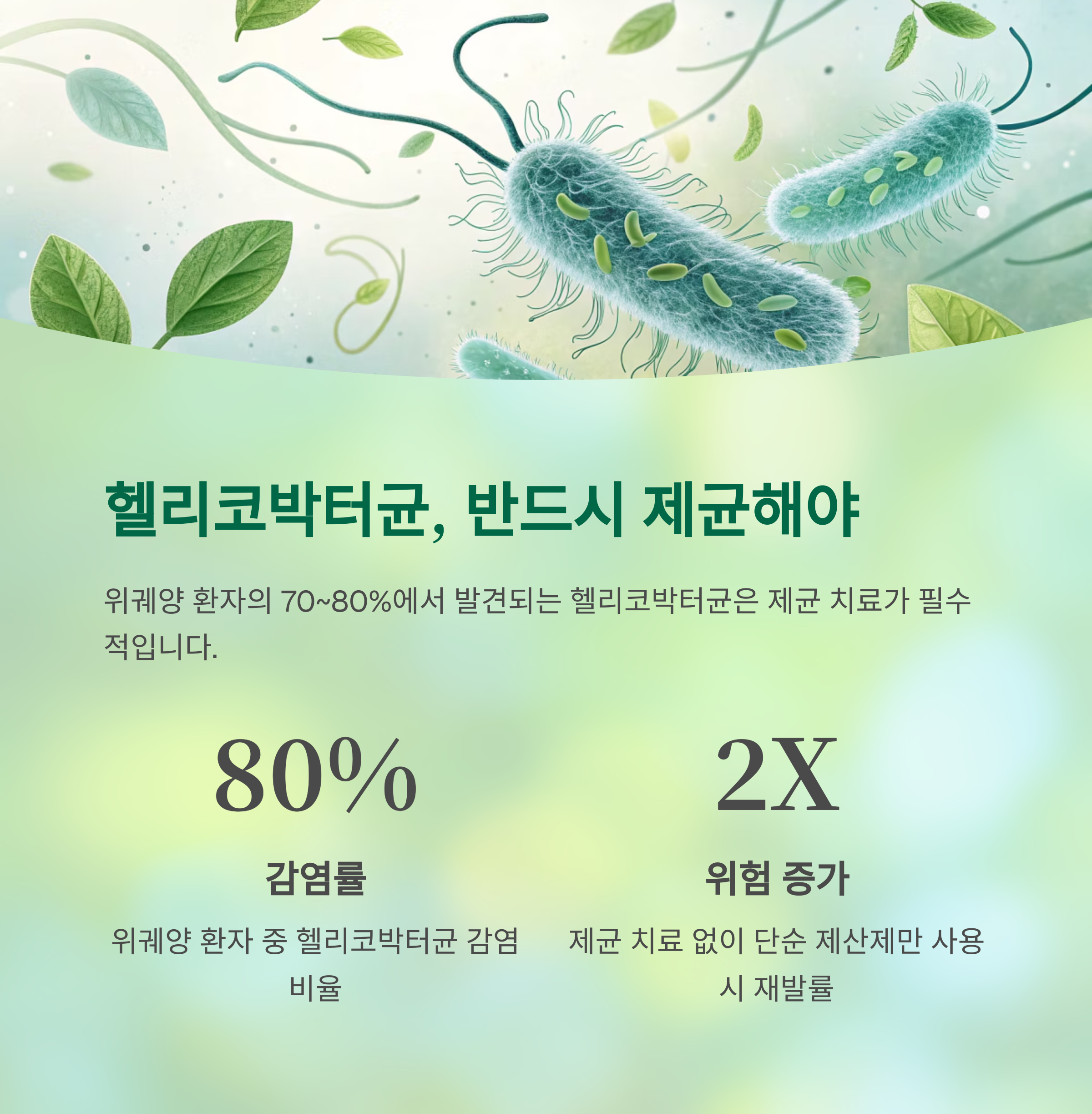 단순 제산제 치료만으로는 재발률이 높으며, 항생제를 통한