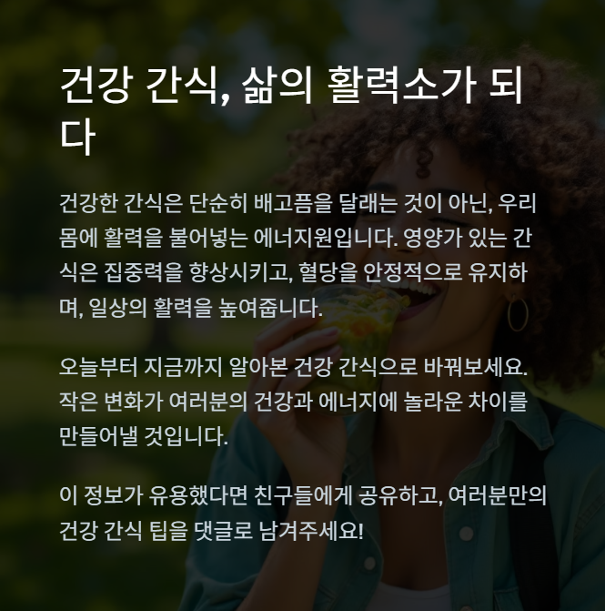 간식, 무조건 참을 필요는 없어요. 오히려 잘 선택하면 건강은 물론 집중력과 기분까지 관리할 수 있답니다. 오늘부터라도 배고픔을 참고 참다가 폭식하는 대신, 작지만 똑똑한 간식으로 일상의 균형을 찾아보세요.