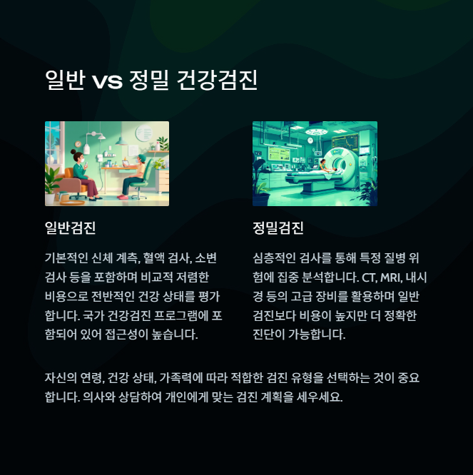 | 검진 범위 | 기초 혈액·소변검사 | MRI, CT, 암표지자 검사 등 |