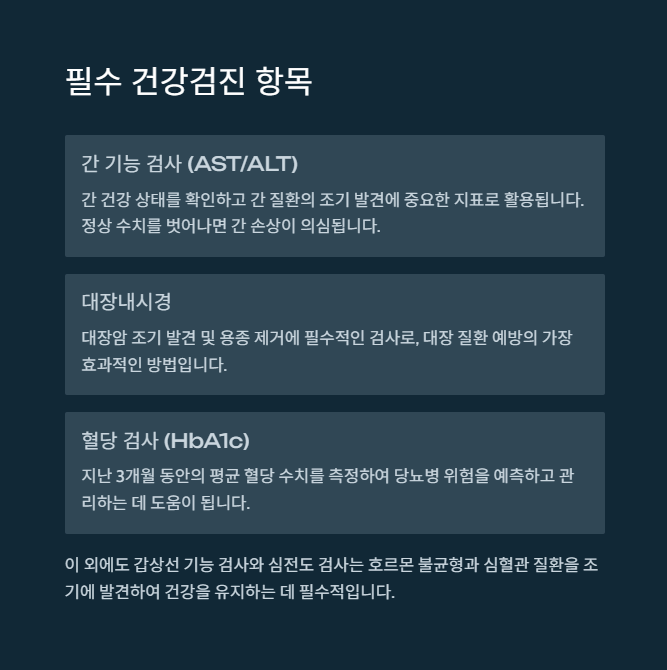 | 검진 항목 | 질병 연관성 | 추천 대상 |