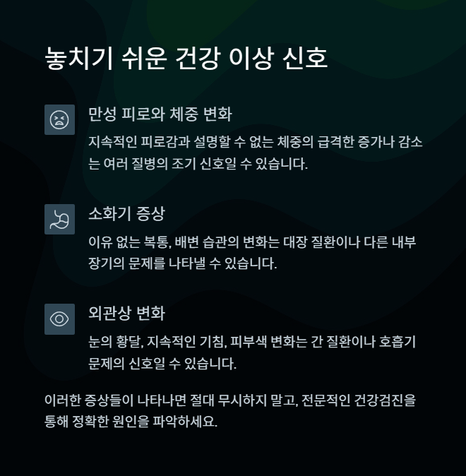 눈 밑이 살짝 부었는데 신장 문제가 있다는 말을 듣고, 처음엔 장난인 줄 알았어요. 그런데 의사들도 초반엔 놓치기 쉬운 신호라고 하더라고요. 특히 가벼운 체중 감소, 이유 없는 멍, 만성 피로 같은 증상은 내과 전문의도 늘 경계하는 징후입니다. 우리도 이런 사소한 신호에 민감해져야 할 때예요.