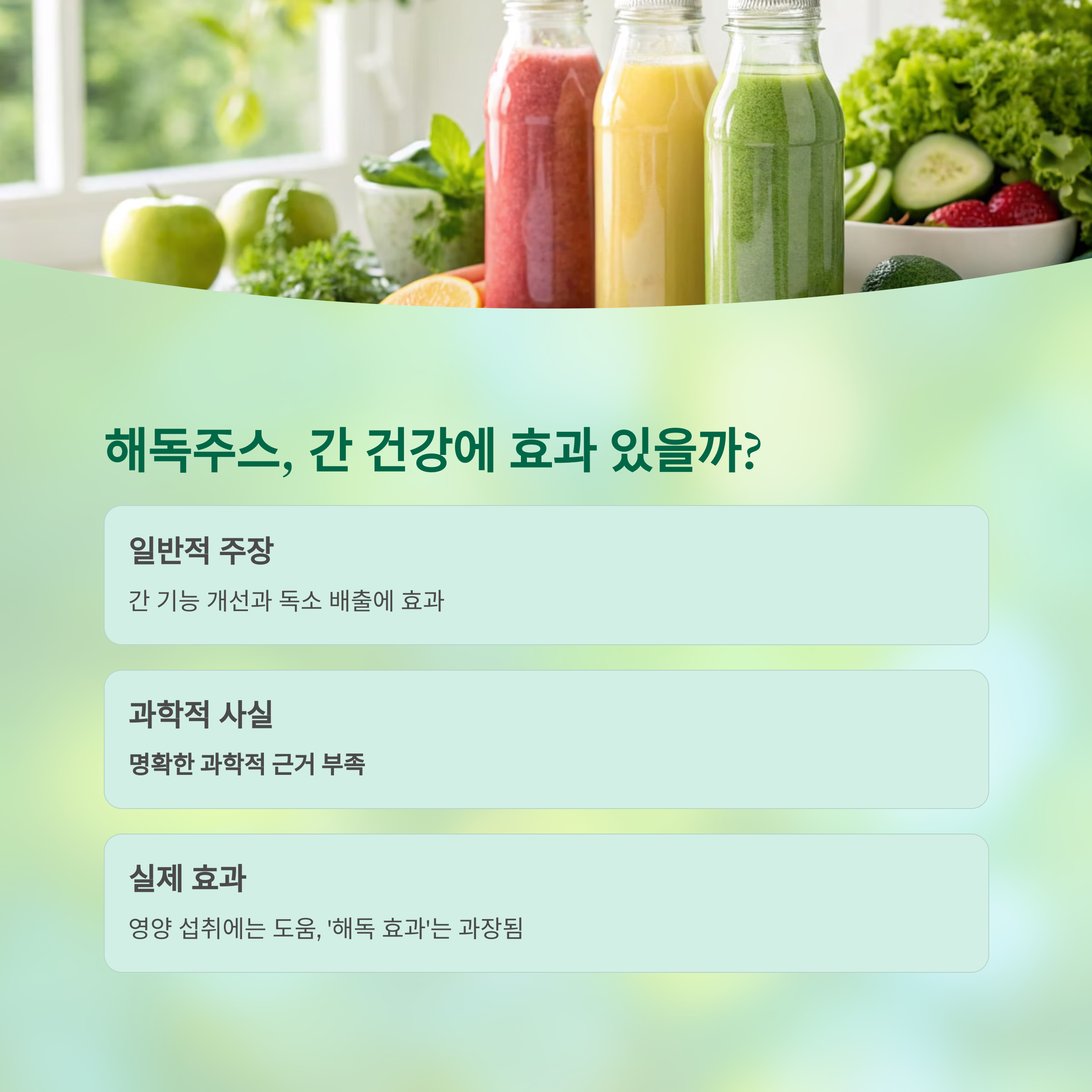 일반적인 해독주스가 간 기능을 눈에 띄게 개선한다는 명확한 과학적 근거는 부족하다"라고 합니다.