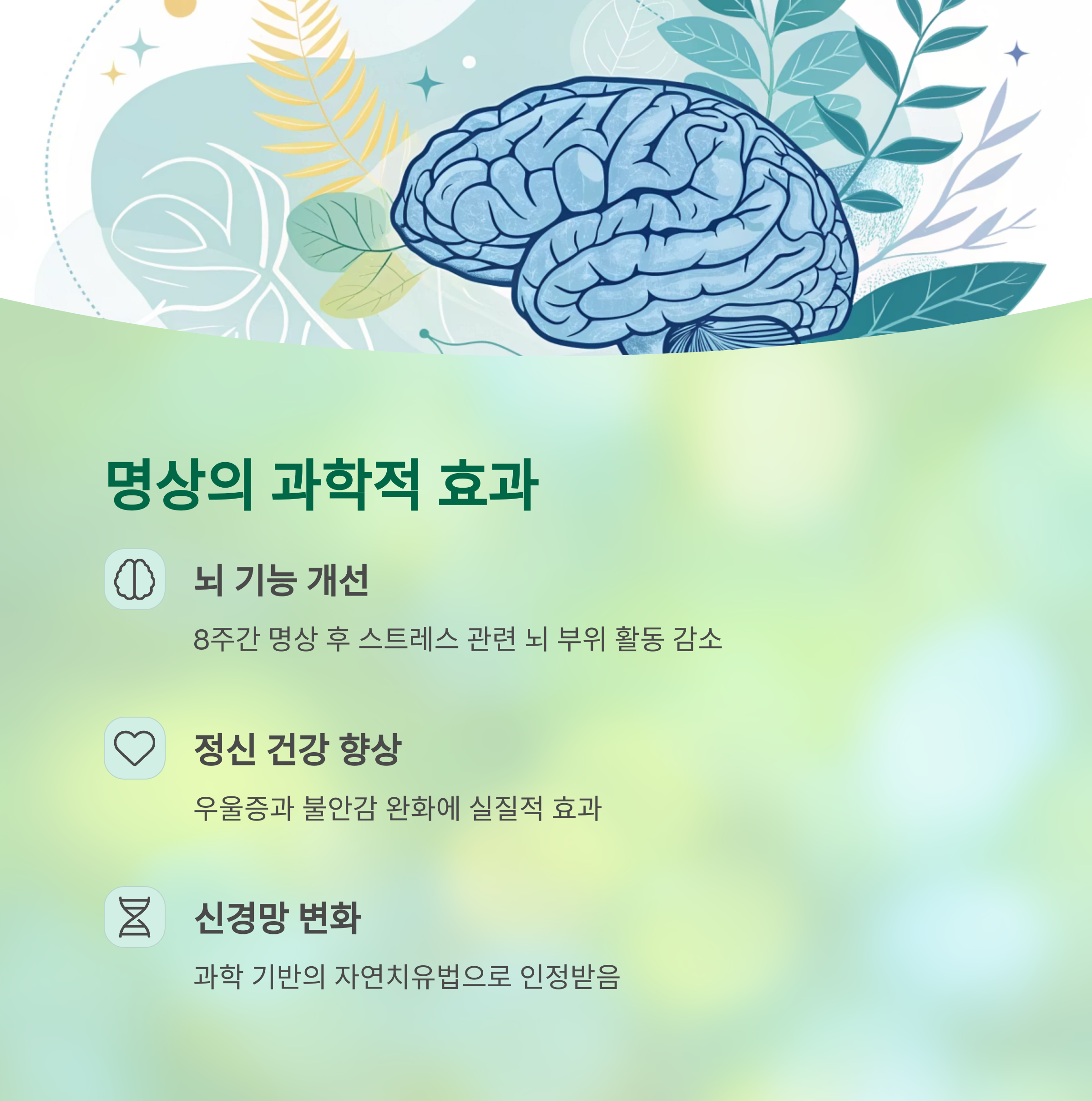 중요: 명상은 뇌 신경망에 변화를 주는 과학 기반의 자연치유법으로 간주됩니다.