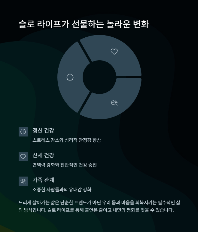 슬로 라이프를 실천하면 단순히 ‘느리게 산다’는 차원을 넘어, 우리의 몸과 마음이 자연과 다시 연결됩니다. 그 결과, 자연 치유력이 활성화되고 다양한 신체적·정신적 효과가 나타나기 시작하죠.