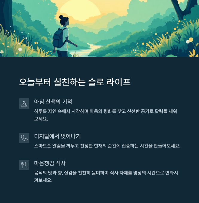 슬로 라이프는 거창하거나 완벽할 필요 없어요. 오늘 하루, 단 10분이라도 여유를 느끼는 시간이 있다면 그것만으로도 충분하죠. 매일 조금씩 실천하며 자신의 삶을 더 따뜻하게, 더 건강하게 변화시켜 보세요. 여러분의 느린 걸음이 결국은 가장 빠른 회복으로 이어질 거예요. 궁금한 점이나 함께 나누고 싶은 이야기가 있다면 댓글로 남겨주세요. 여러분의 슬로 라이프 여정을 응원합니다!