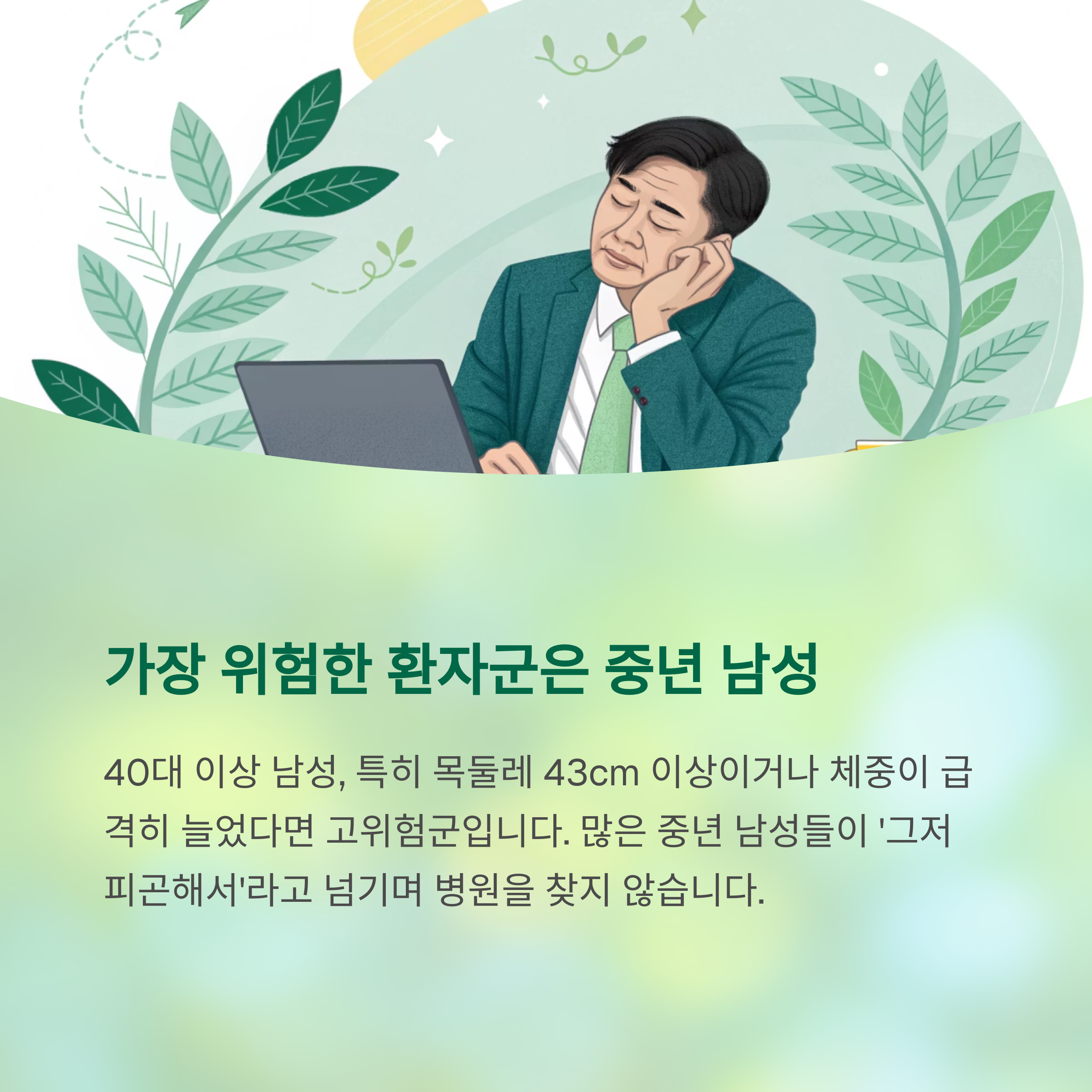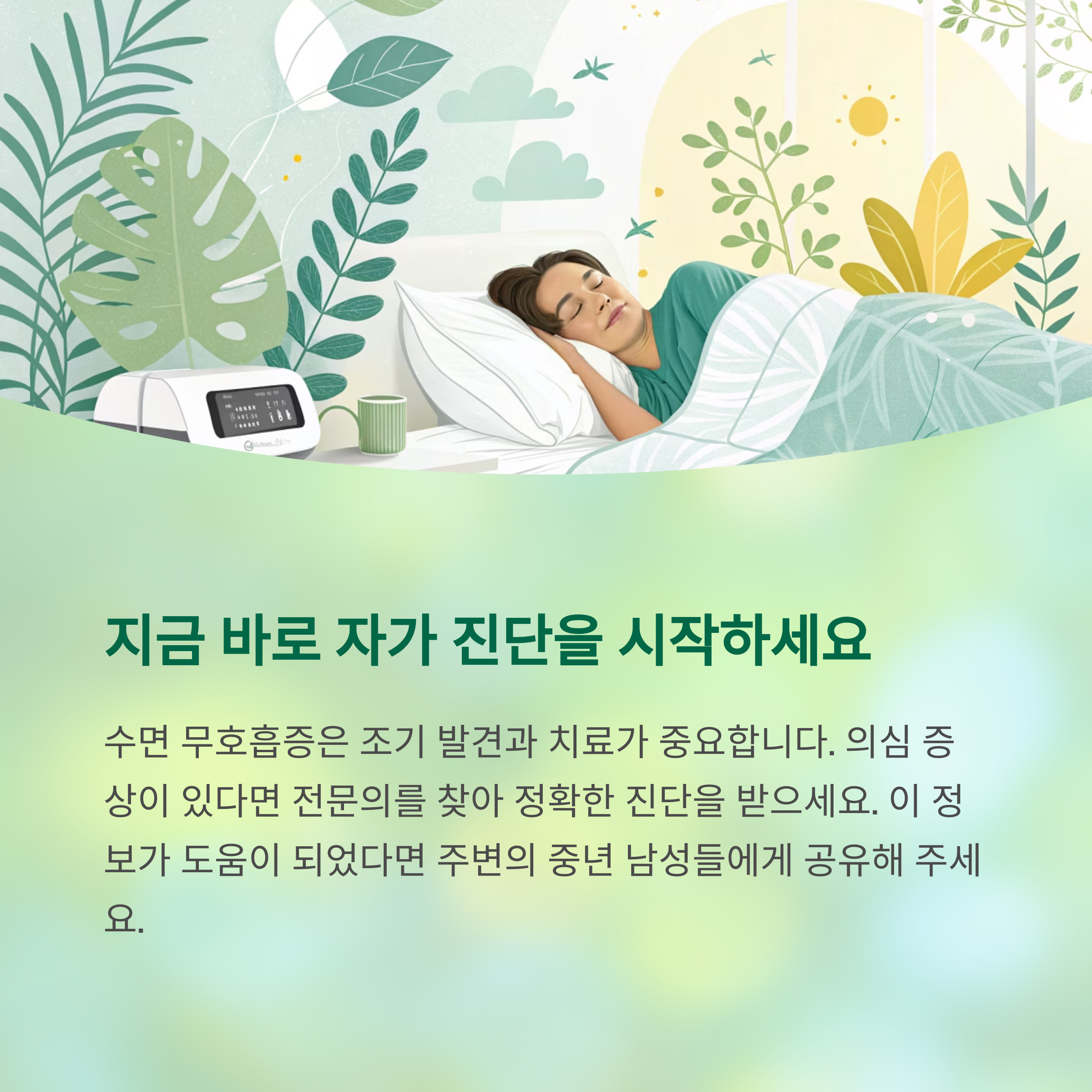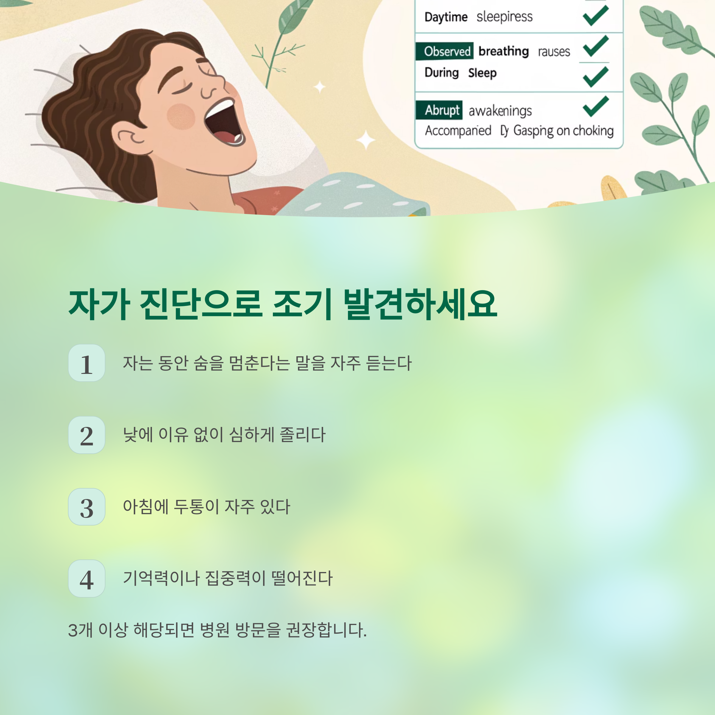 특히 중년 남성, 비만 체형, 코골이 증상이 있는 경우 반드시 자가 진단이 필요합니다.