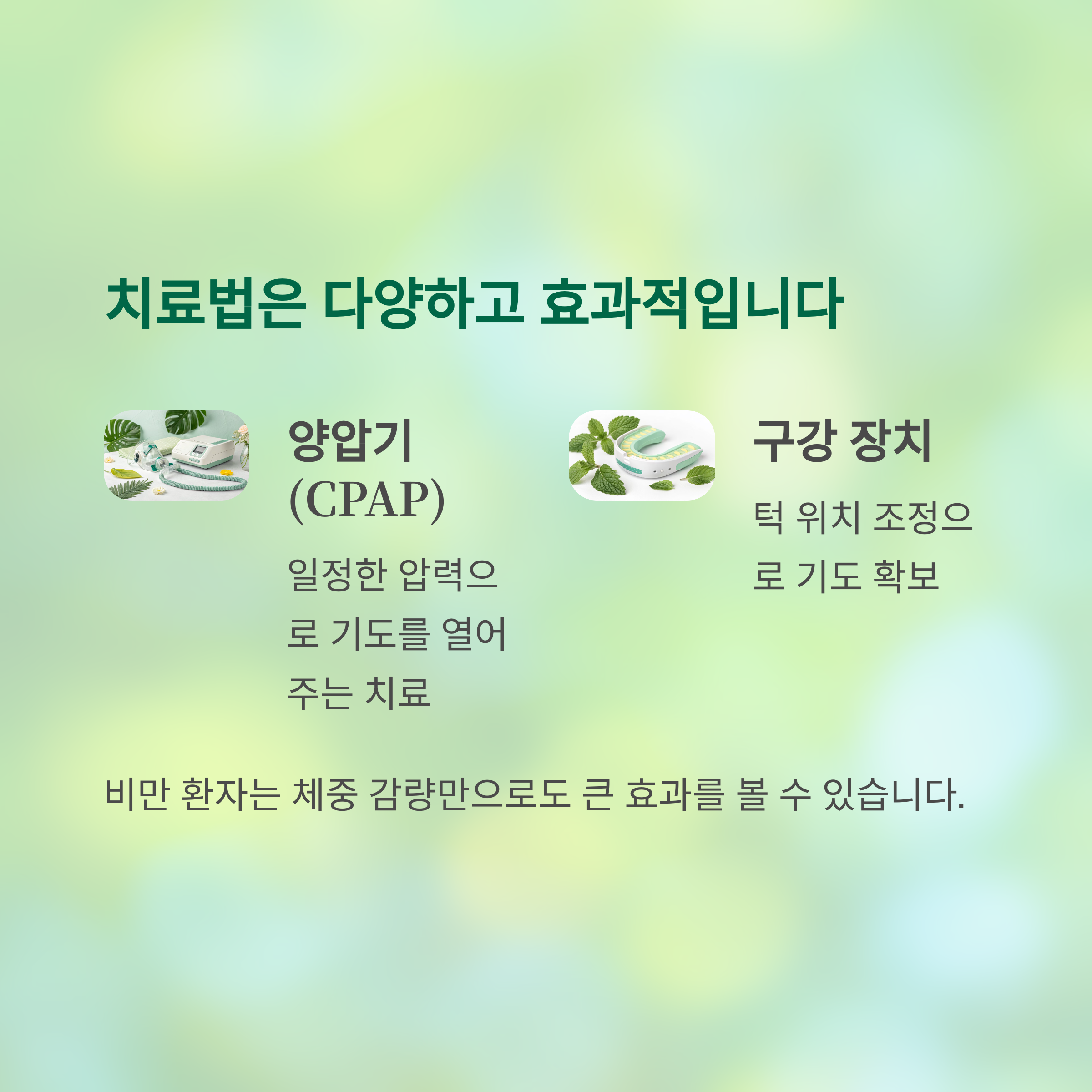 대표적으로 양압기 치료, 구강 장치, 수술적 교정 등이 있으며