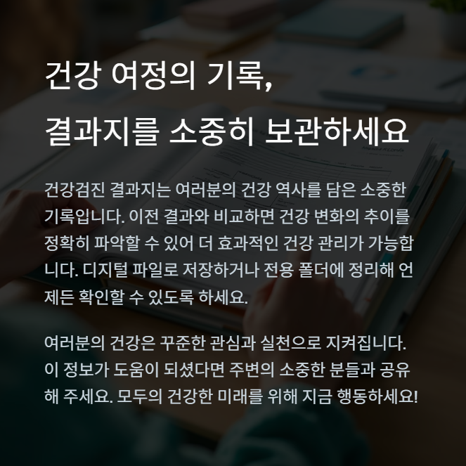 건강검진은 끝이 아니라 시작입니다. 진짜 중요한 건 결과지를 보고 내가 얼마나 바뀌는가에 달려 있어요. 무심코 넘겼던 수치 하나가 수년 후 병으로 이어질 수도 있고, 오늘 실천한 한 끼, 한 걸음이 건강한 노년을 선물할 수도 있죠. 지금 결과지를 꺼내세요. 그리고 행동으로 옮기세요. 몸은, 우리가 행동한 만큼만 반응합니다.