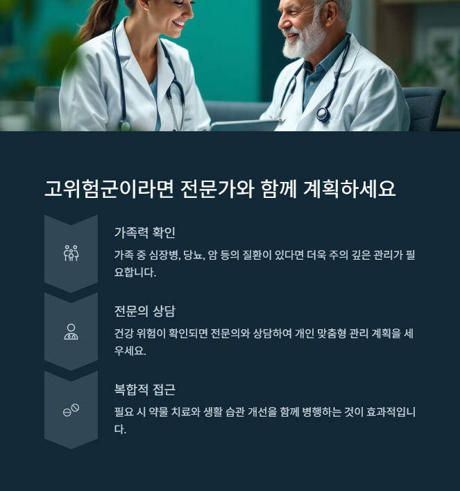 혈압, 혈당, 콜레스테롤 수치가 경계에 있다면 ‘위험군’입니다. 당장은 약 처방을 안 받을 수 있어도, 그대로 방치하면 고혈압, 당뇨, 고지혈증으로 진행될 수 있어요. 아래는 질병별 실천 계획 예시입니다.