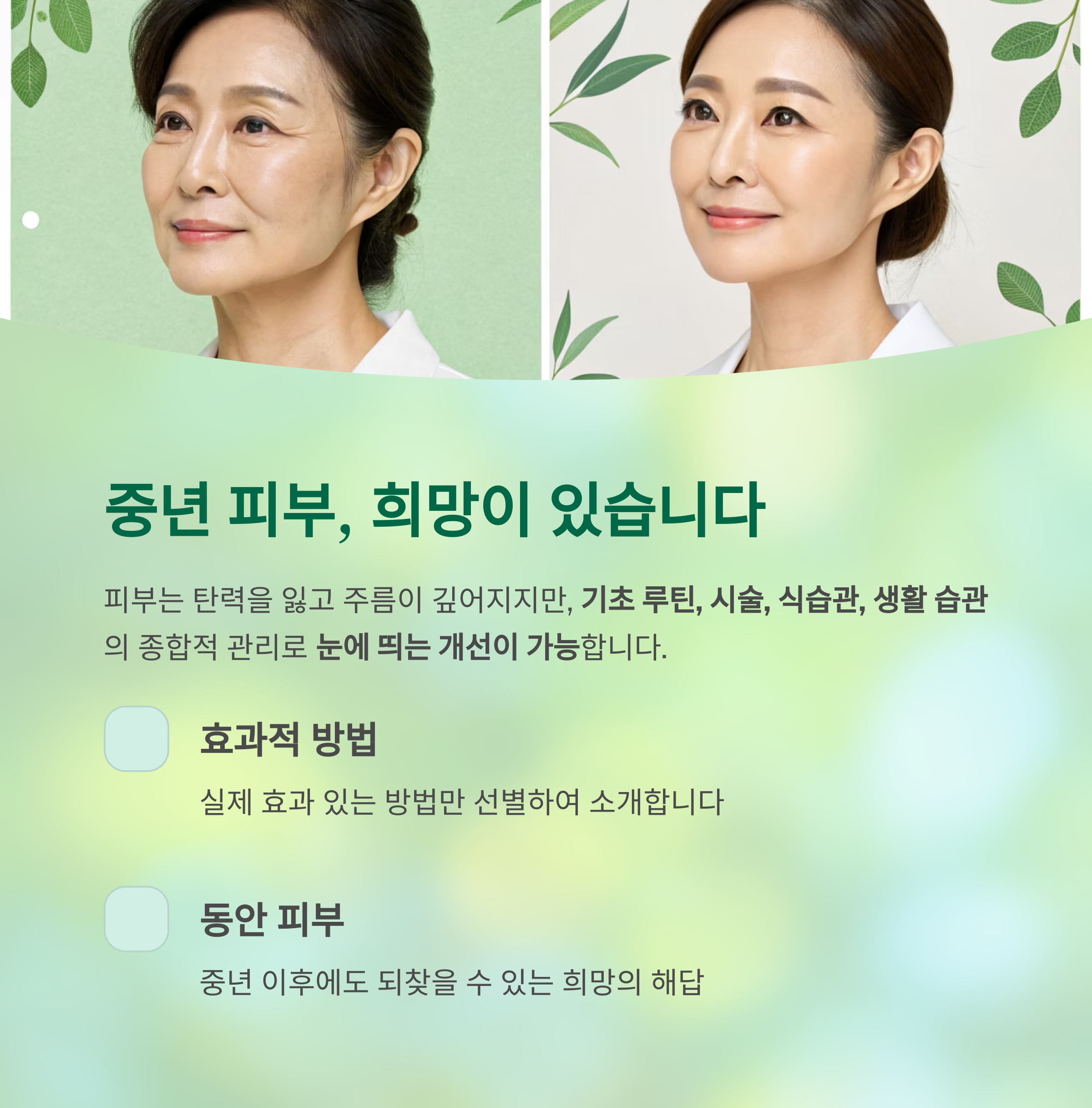 중년 이후에도 동안 피부를 되찾을 수 있다는 희망의 해답을 전해드립니다.