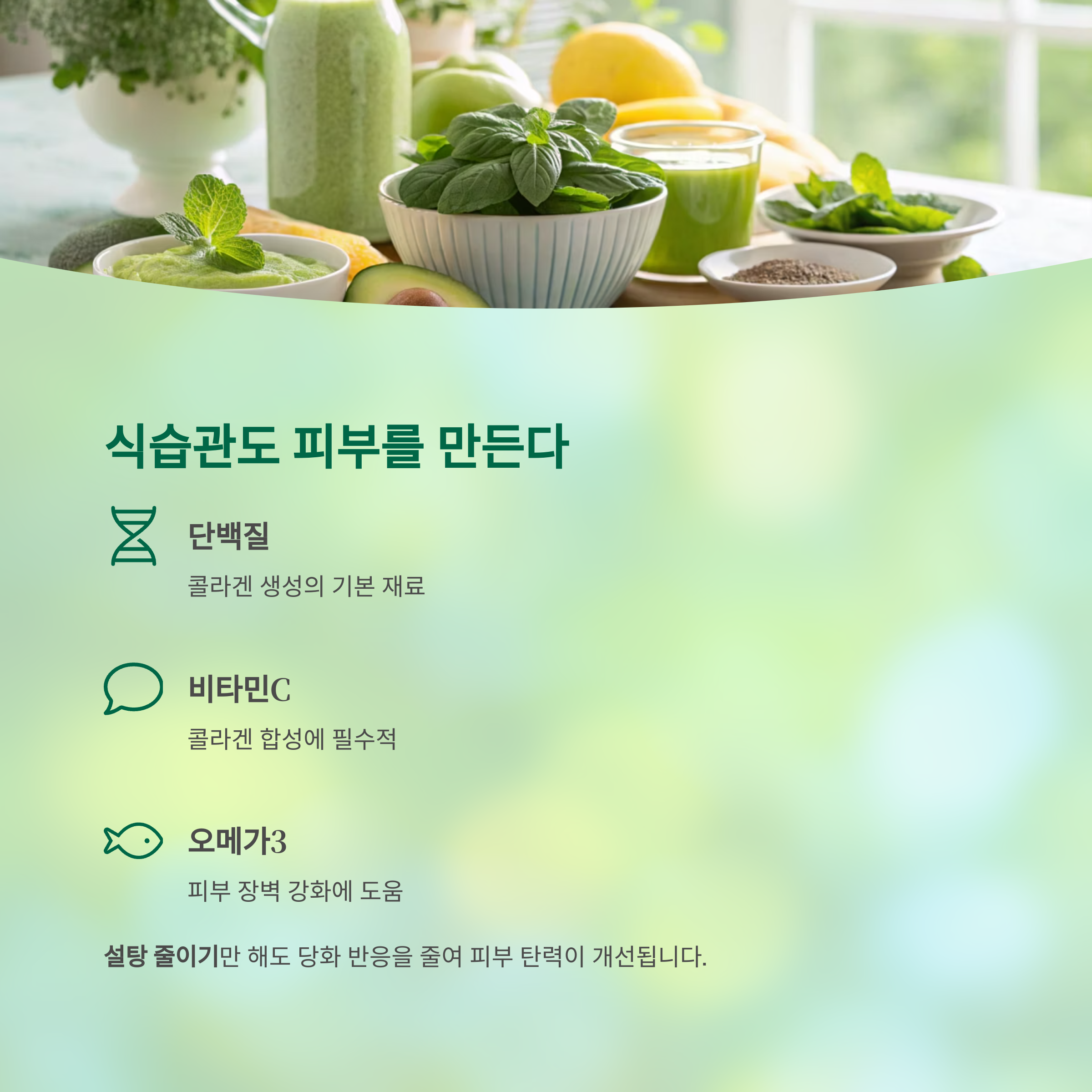 콜라겐 보충을 위해서는 단백질, 비타민C, 아연, 오메가3가 포함된 식단이 핵심입니다.