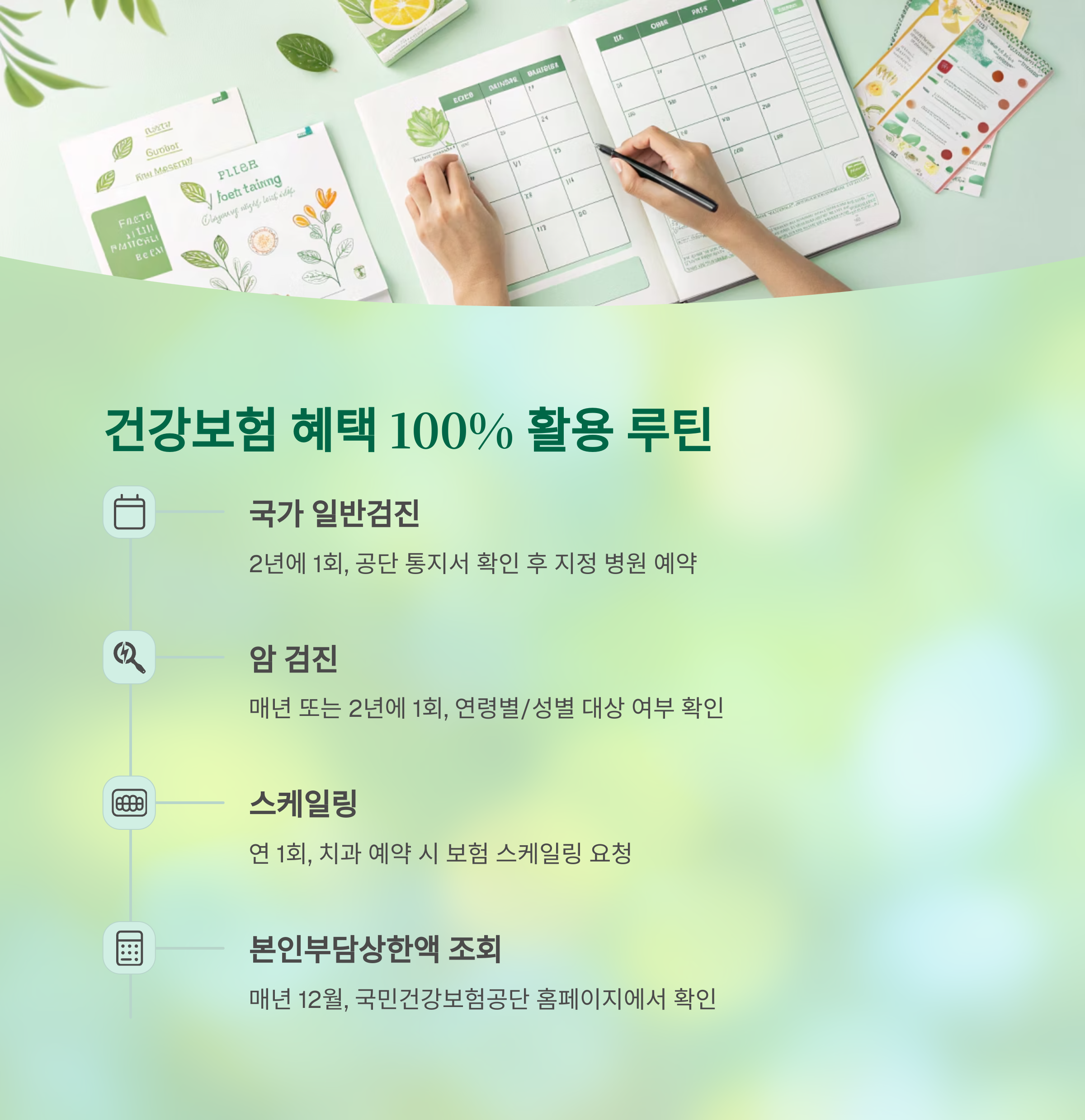 | 스케일링 | 연 1회 | 치과 예약 시 보험 스케일링 요청 |
