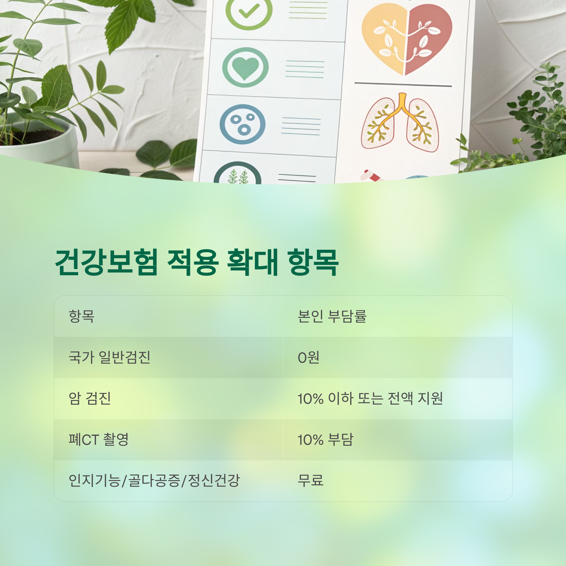 | 암 검진 | 위·대장·간·유방·자궁경부 등 | 10% 이하 또는 전액 지원 |