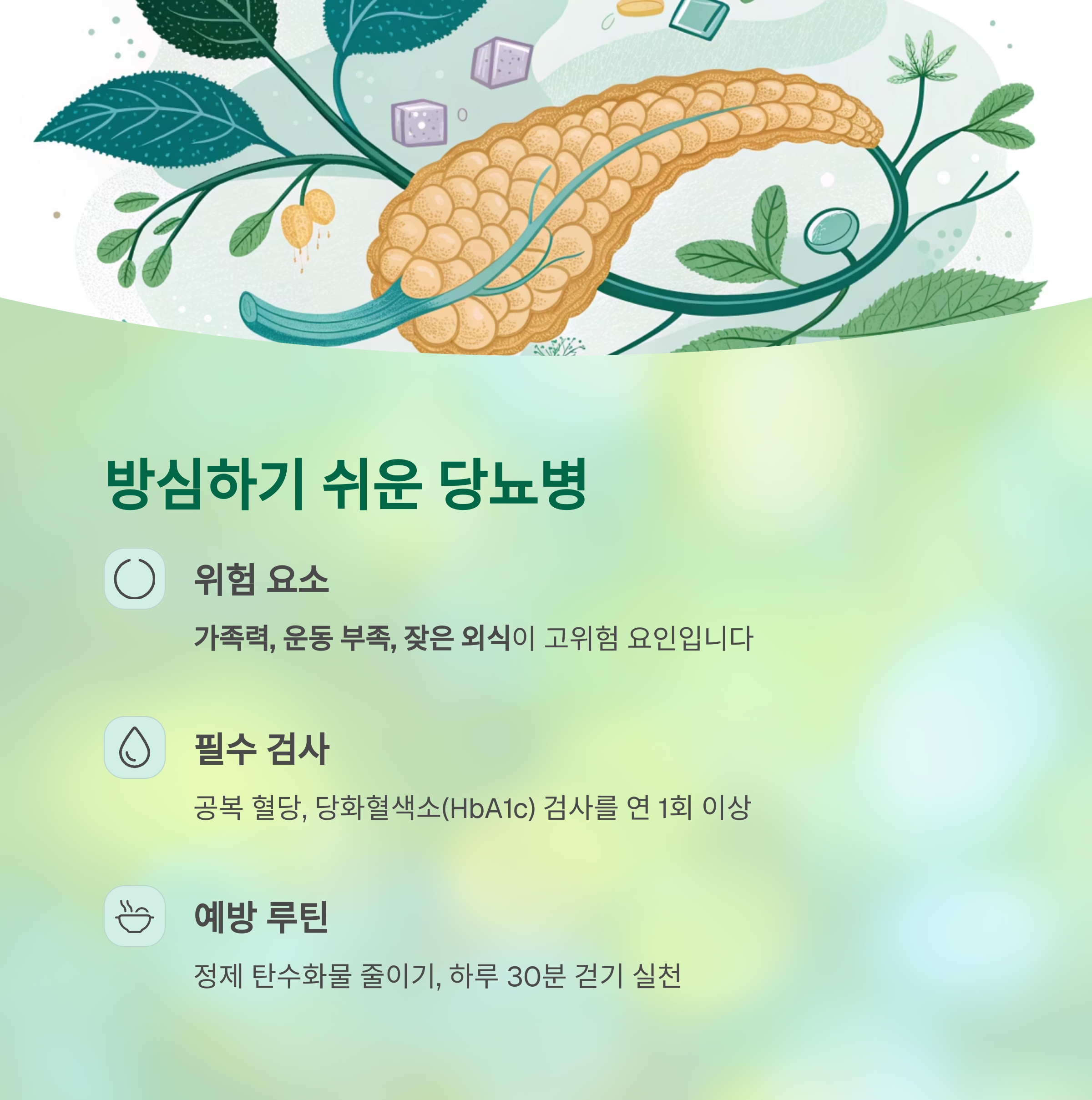 | 당뇨병 | 공복 혈당, HbA1c | 설탕 줄이기, 걷기 습관 |