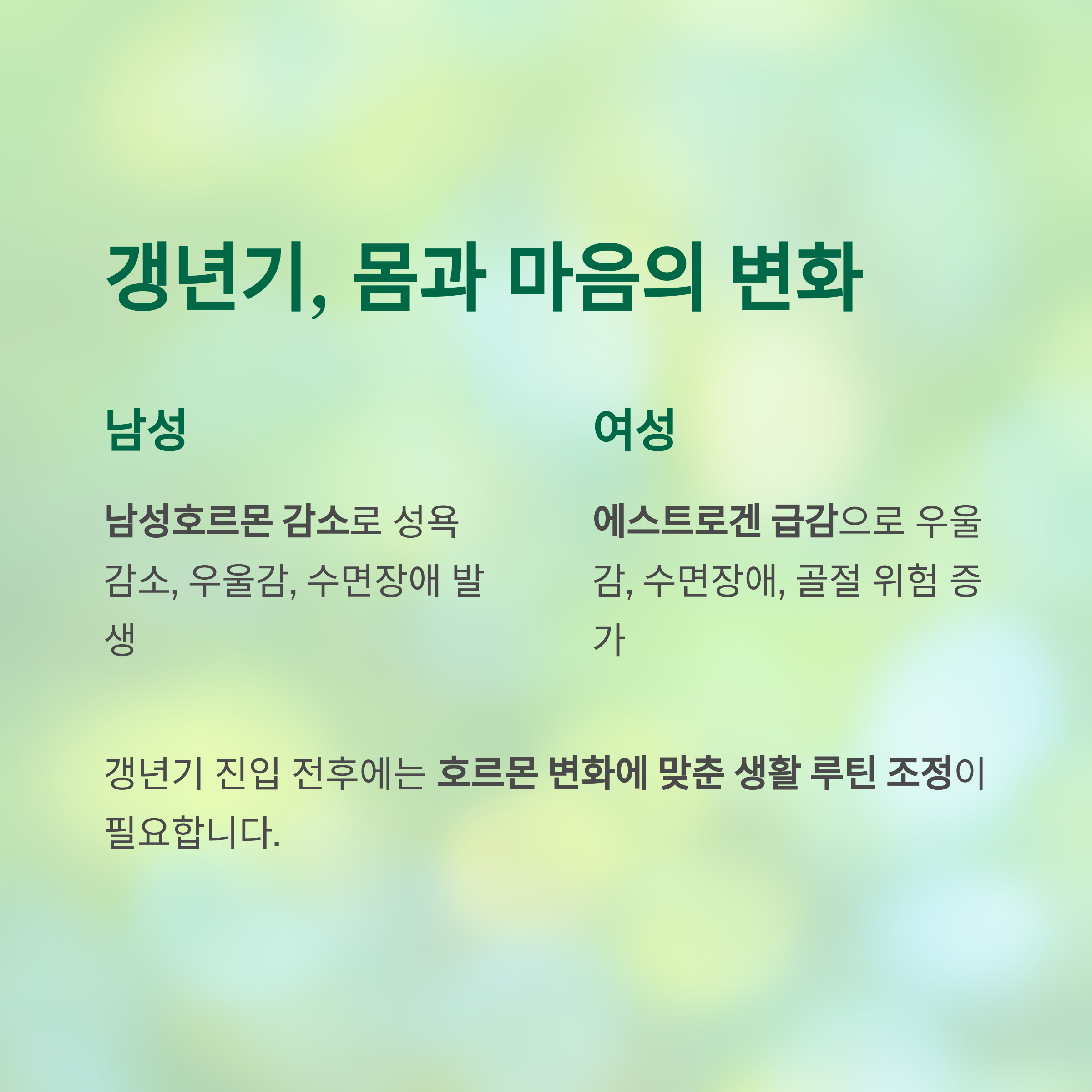 | 갱년기 질환 | 남성/여성 호르몬 | 요가, 스트레칭, 명상 루틴 |