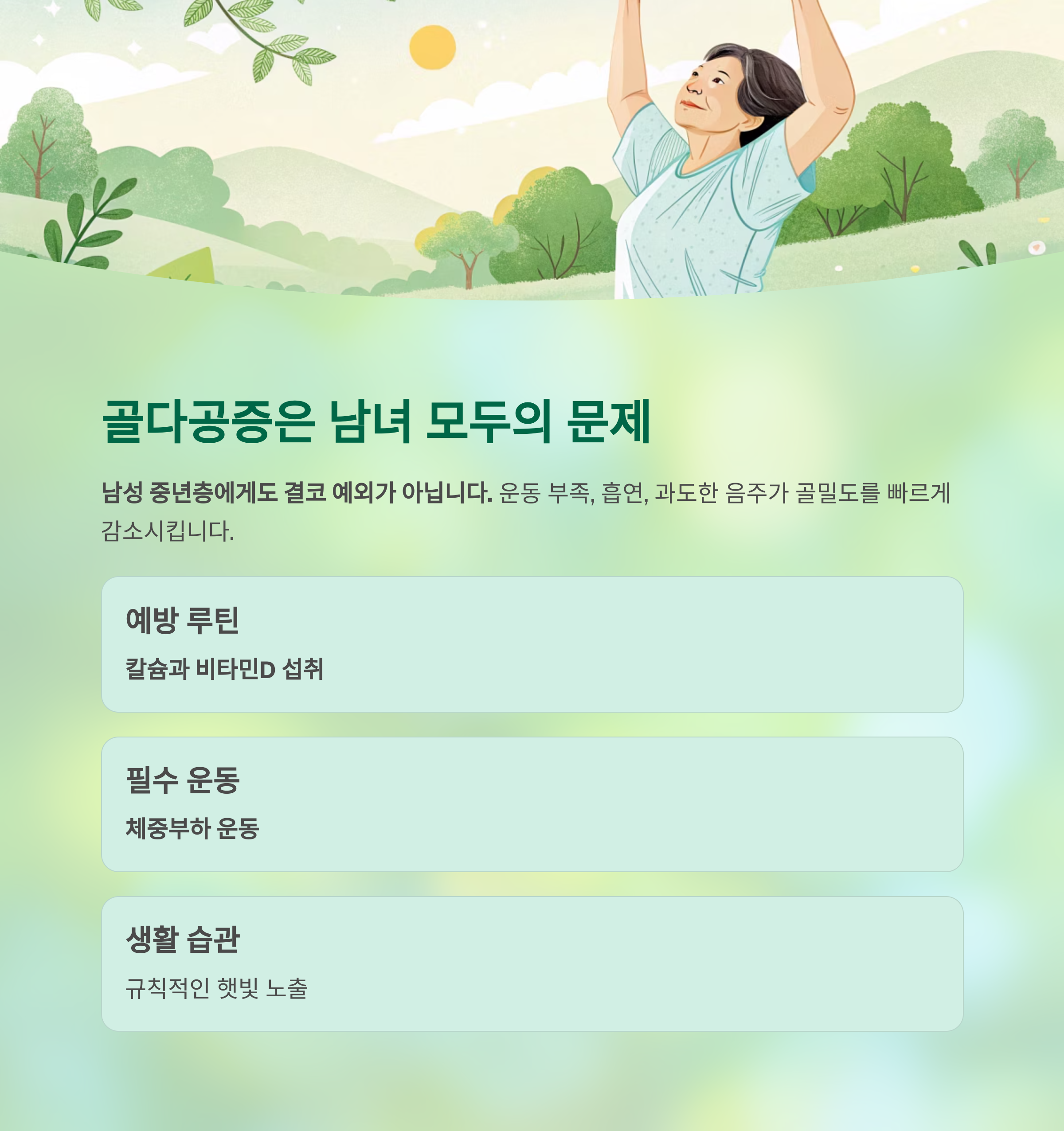 칼슘과 비타민D 섭취, 체중부하 운동, 햇빛 노출을 생활화해야 합니다.