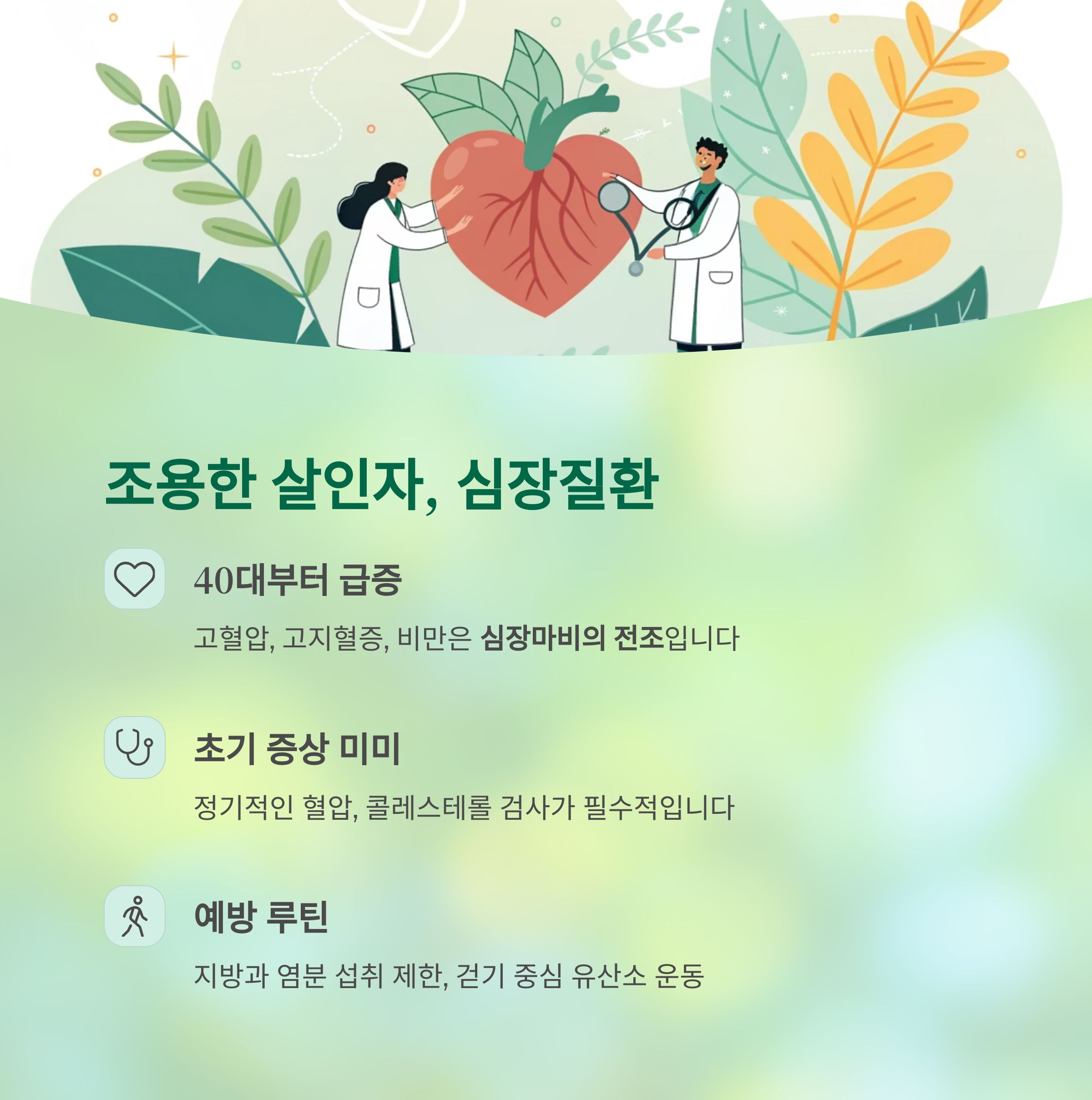 | 심장질환 | 혈압, LDL, HDL | 저염식, 걷기 30분 |
