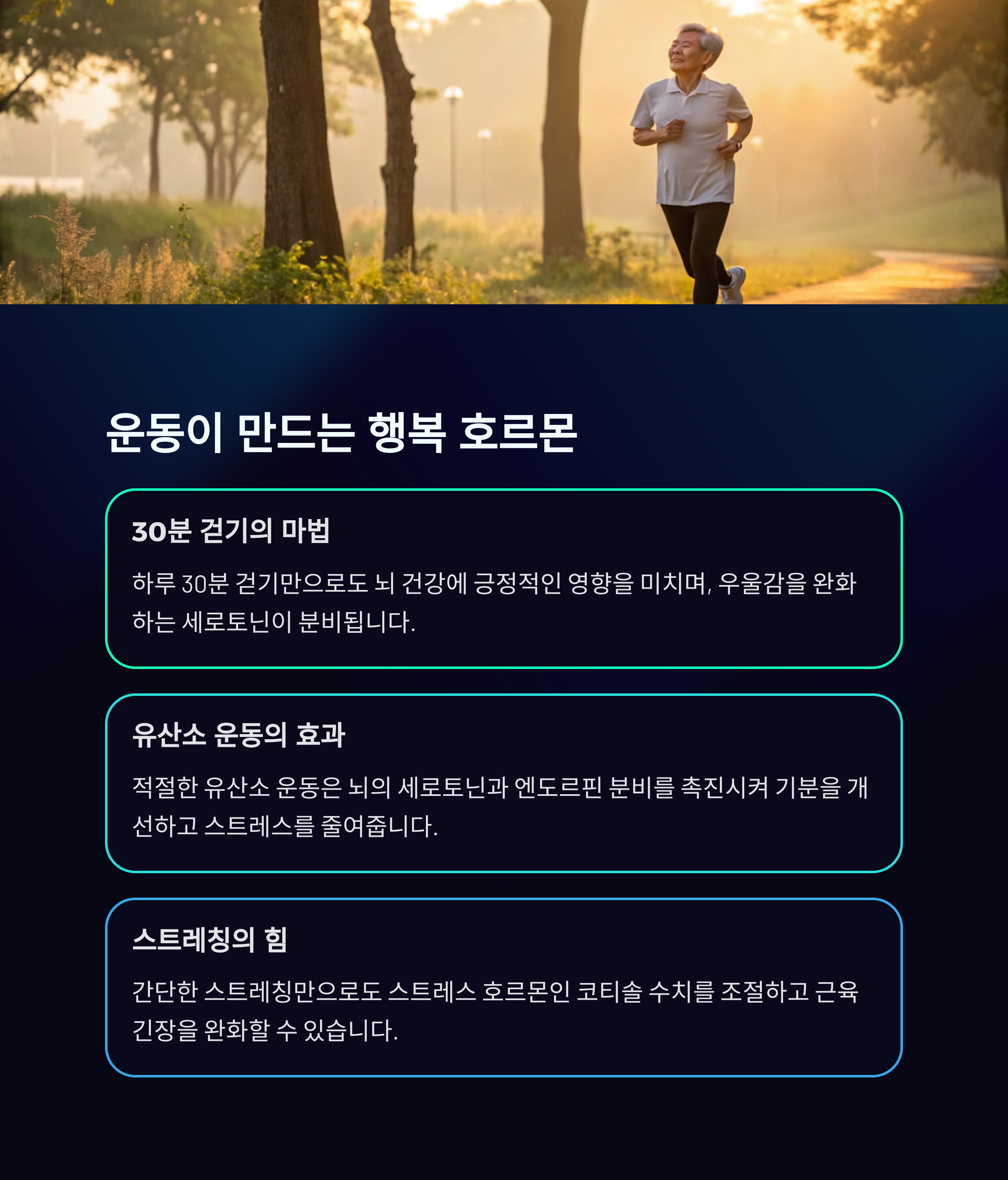 "하루 30분 걷기"만으로도 우울감을 상당히 줄일 수 있습니다.