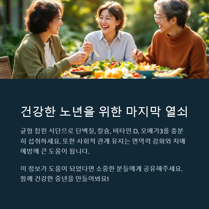 특히 단백질, 칼슘, 비타민 D, 오메가 3은 꼭 챙겨야 할 필수 영양소예요. 간단하게 정리해 볼게요.