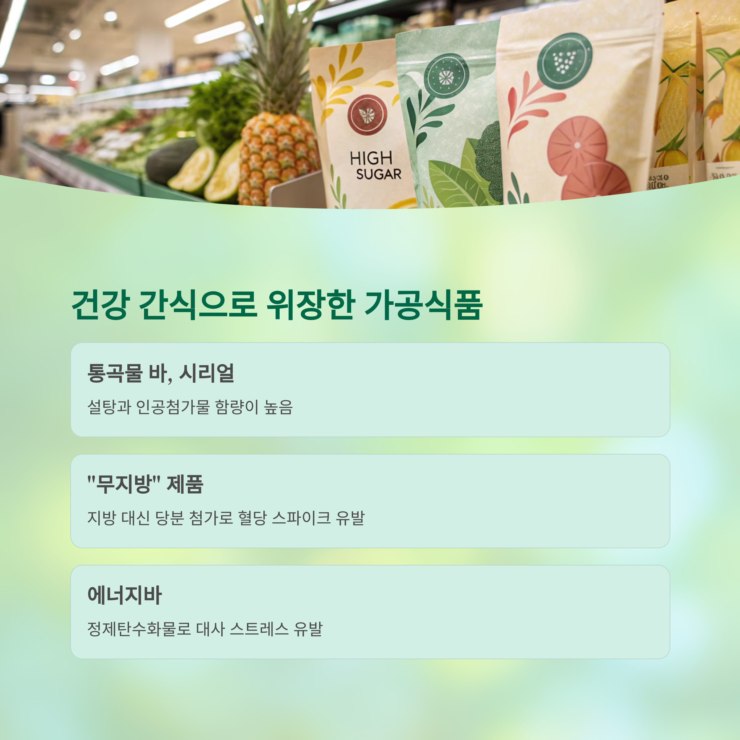 | 에너지바 | 정제탄수화물 | 대사 스트레스 유발 |