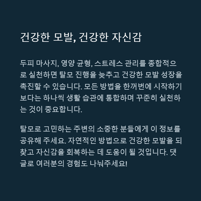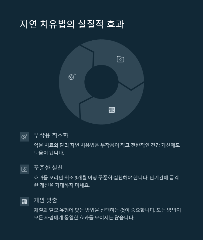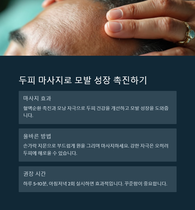 | 자연 치유법 (두피 마사지, 한방 차, 생활 습관) | 부작용 거의 없음, 장기적 효과 | 효과가 느리며 개인차 있음 |