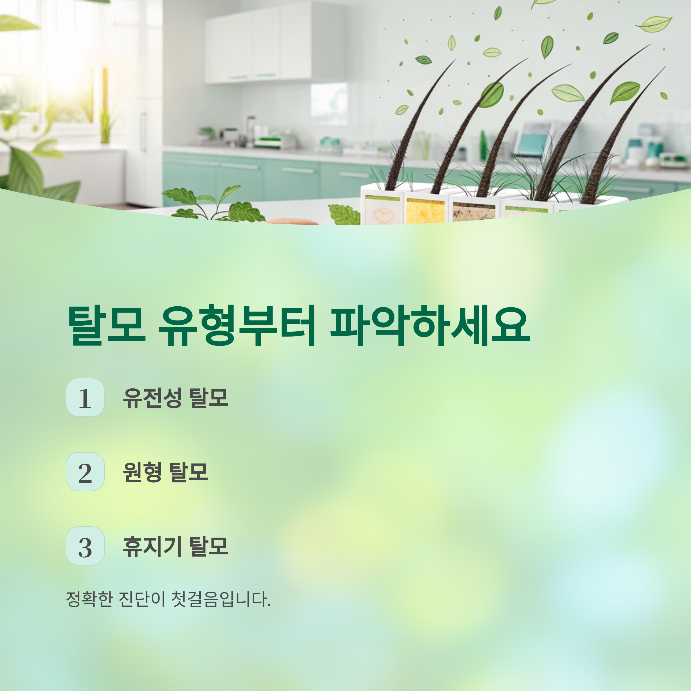 병원 방문을 통해 자신의 탈모 유형을 파악하는 것이 가장 첫걸음입니다.