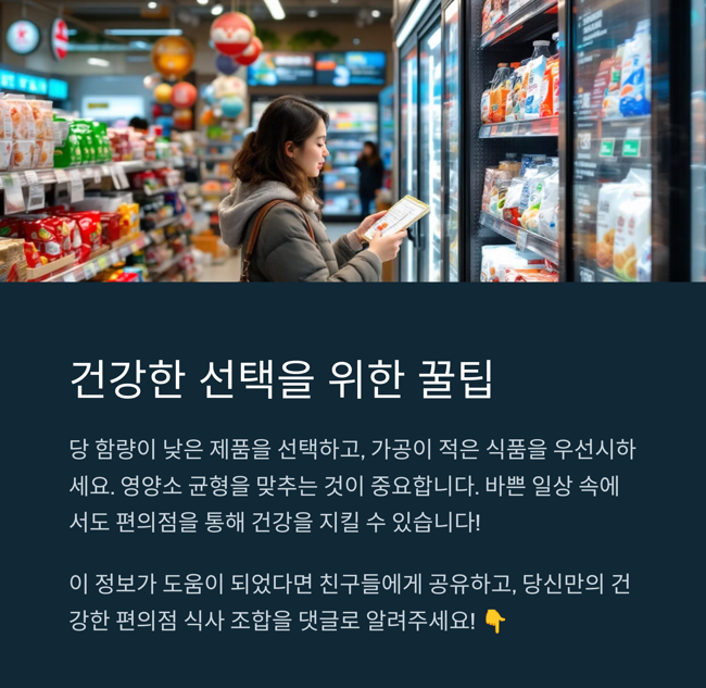 중요한 것은 영양 균형을 맞추고, 가공이 적은 제품을 선택하는 것이죠. 작은 습관이 쌓이면 어느새 건강한 식습관이 자리 잡게 됩니다. 여러분도 편의점에서 즐겨 먹는 건강한 조합이 있나요? 댓글로 공유해 주세요! 😊