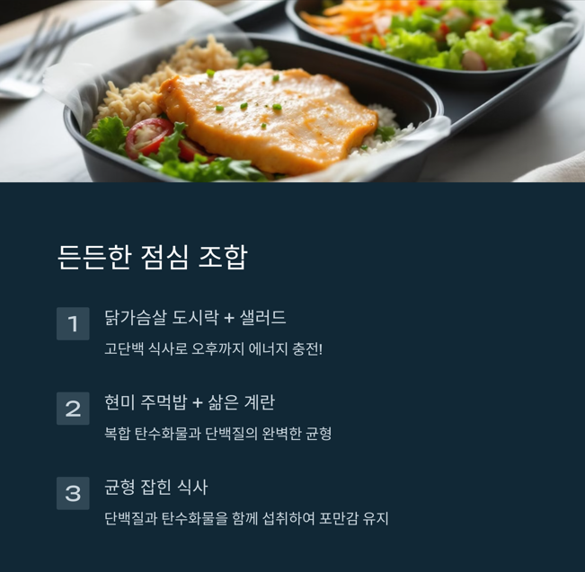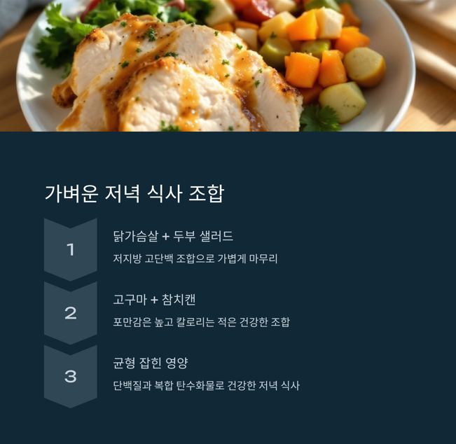 | 고단백 저녁 | 닭가슴살 + 두부 샐러드 + 무가당 요거트 |