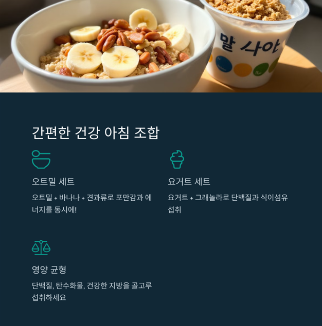 시간 없이 급하게 먹어야 한다면 바나나 + 두유, 오트밀 + 견과류 조합을 추천해요. 포만감이 높으면서도 소화가 잘돼서 바쁜 아침에 부담 없이 섭취할 수 있습니다.