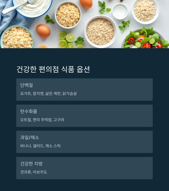 | 단백질 | 닭가슴살, 삶은 계란, 두부바, 참치캔 |