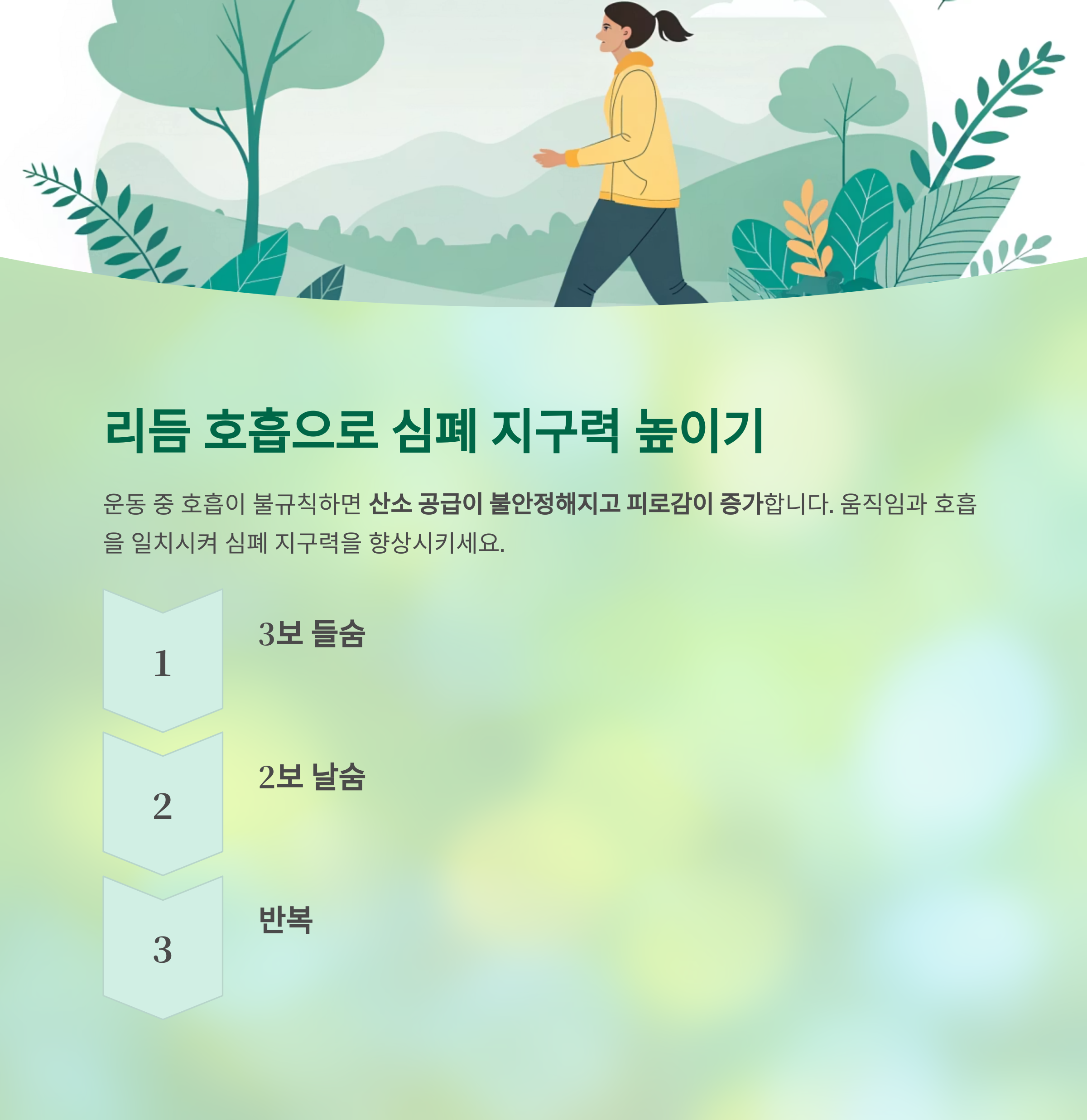 이러한 호흡 리듬은 호흡 효율을 끌어올려 운동 지속력을 향상시킵니다