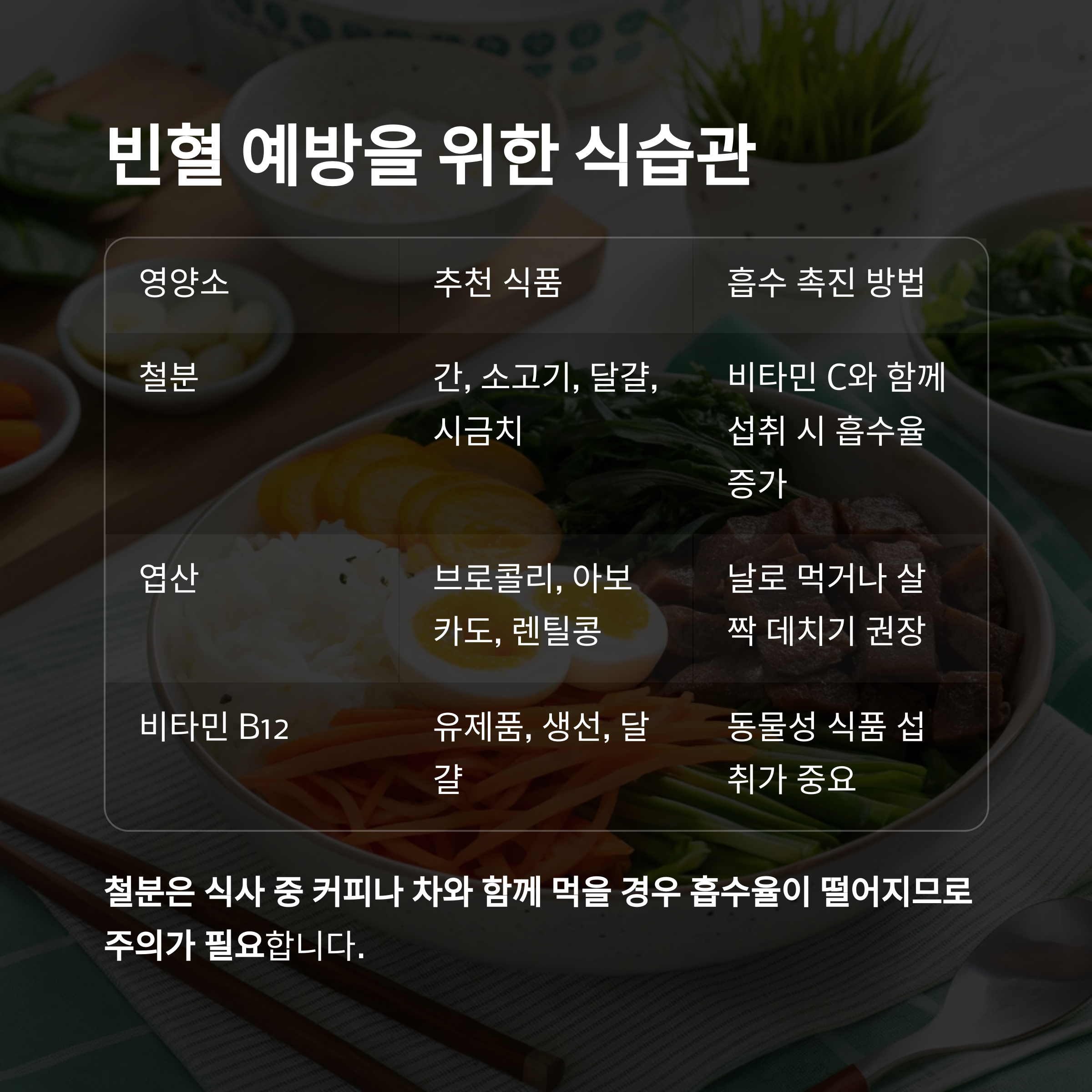 빈혈은 대부분 식습관과 생활 패턴만으로도 충분히 예방하거나 완화할 수 있습니다.