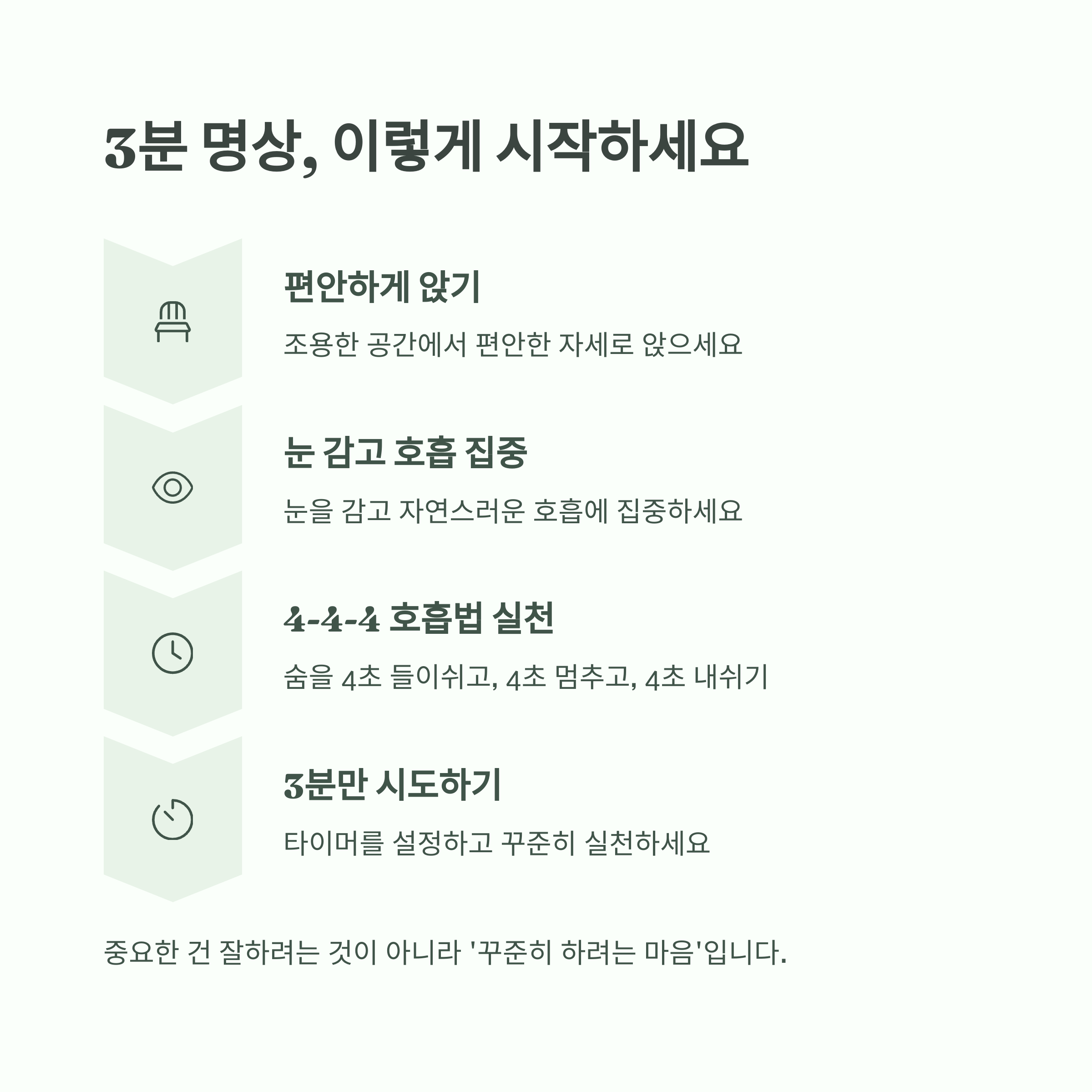 - 생각이 떠오르면 흘려보내고 다시 호흡에 집중