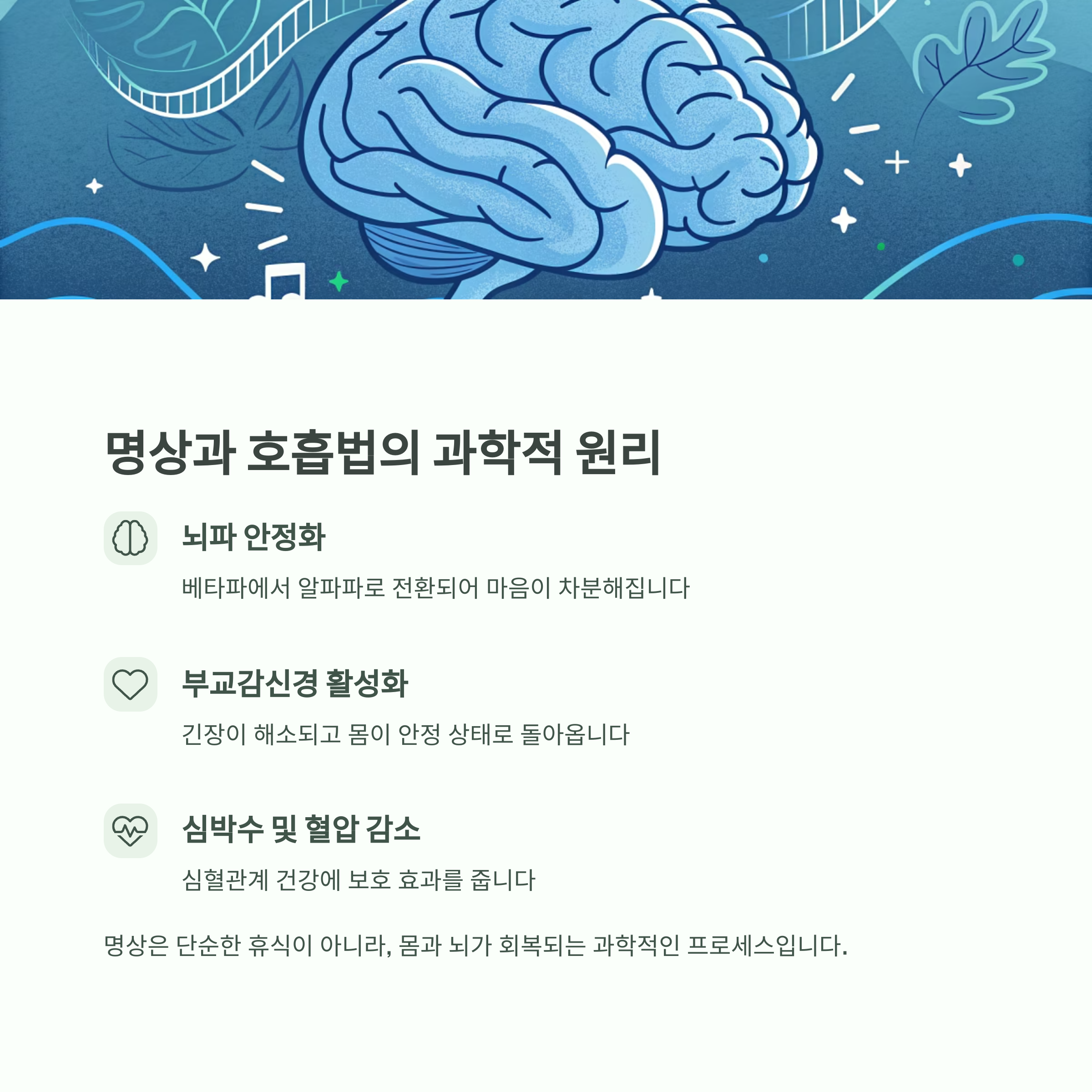 - 뇌파 안정화: 베타파 → 알파파 전환