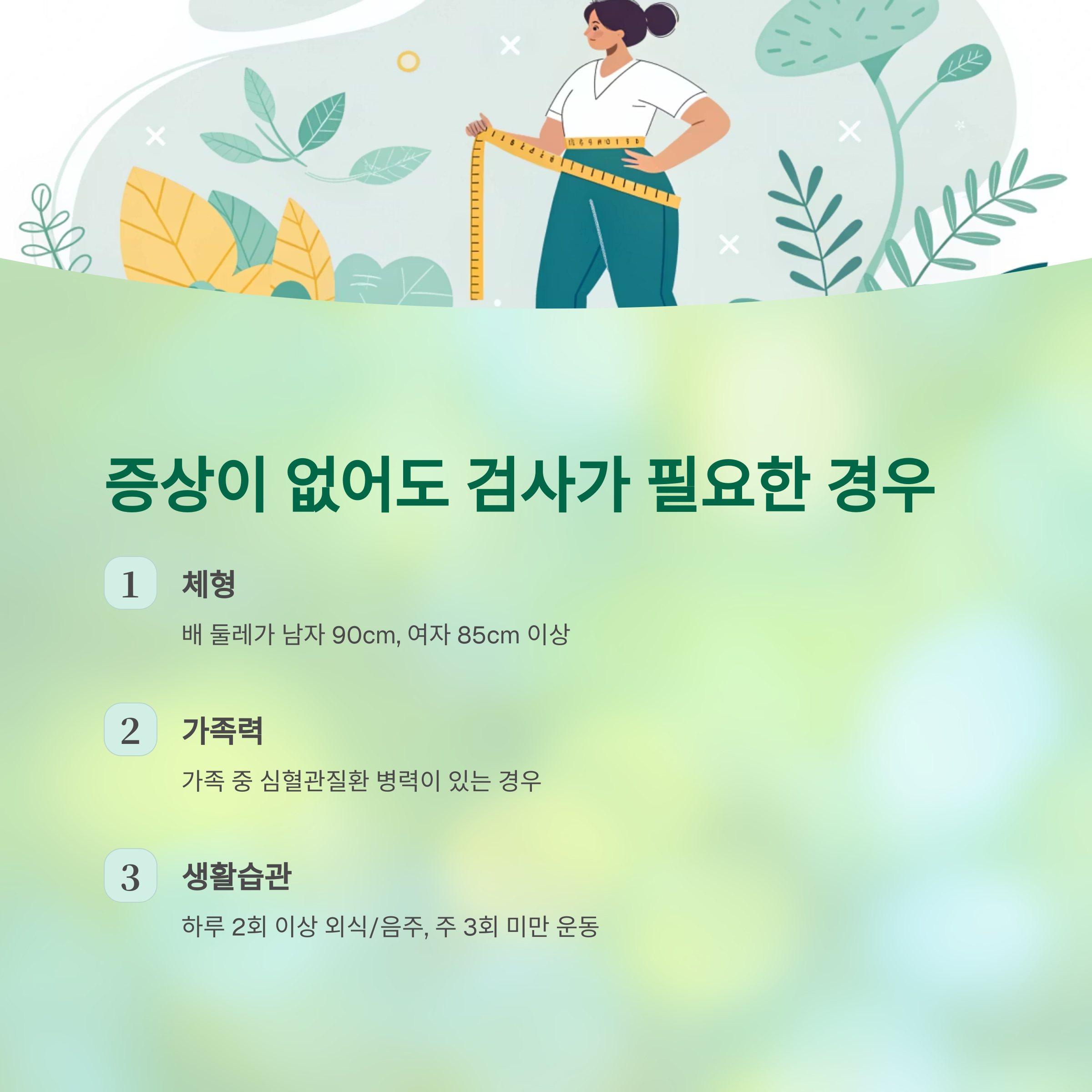 한 가지 이상 해당되면 건강검진에서 혈압, 혈당, 지질 수치 확인이 필요합니다.