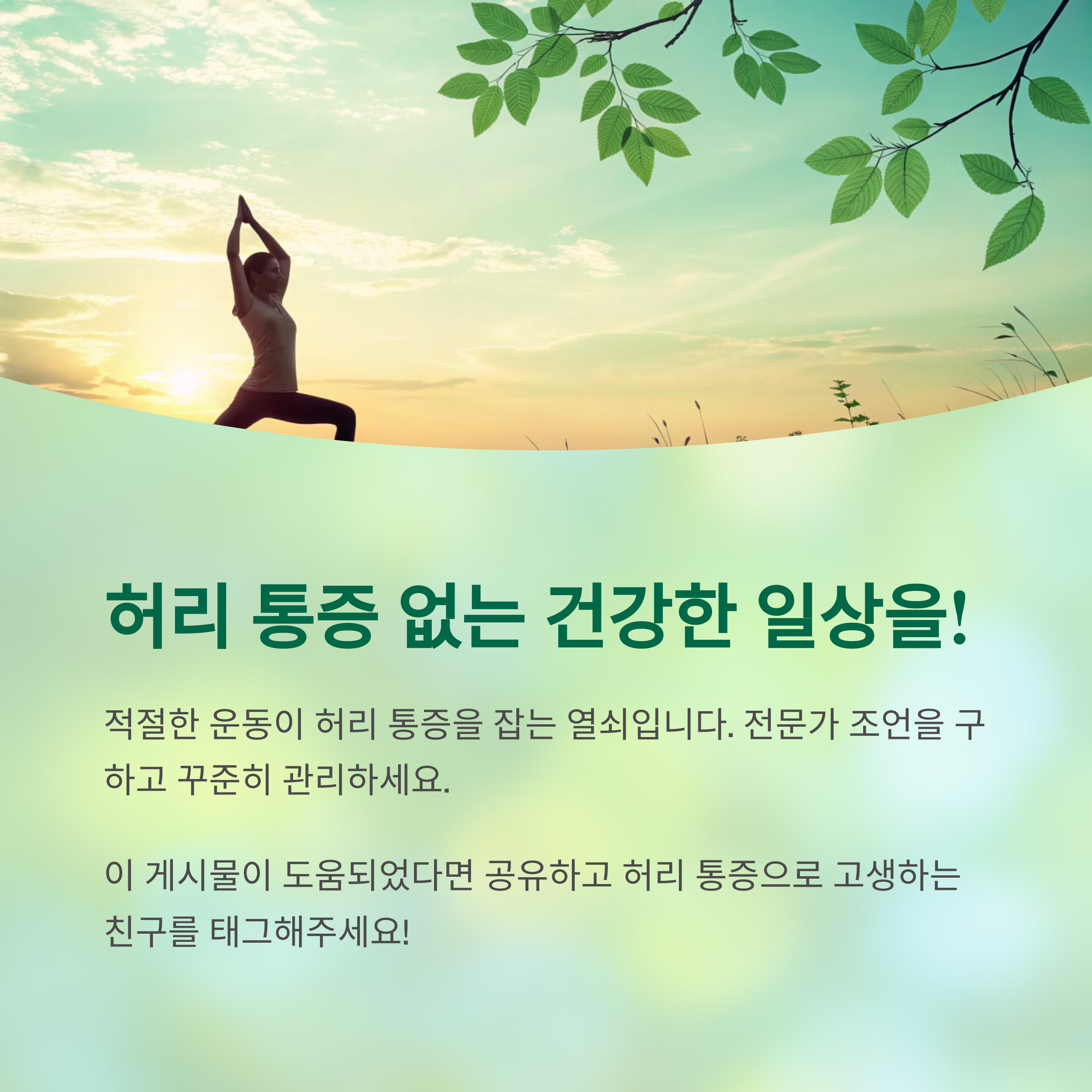 허리 통증을 잡는 열쇠는 "적절한 운동"입니다 운동을 시작하기 전 반드시 자신의 허리 상태를 확인하고, 전문가의 조언을 구하여 적절한 운동법을 선택하세요 꾸준히 관리하면 허리 통증 없는 건강한 일상을 누릴 수 있습니다