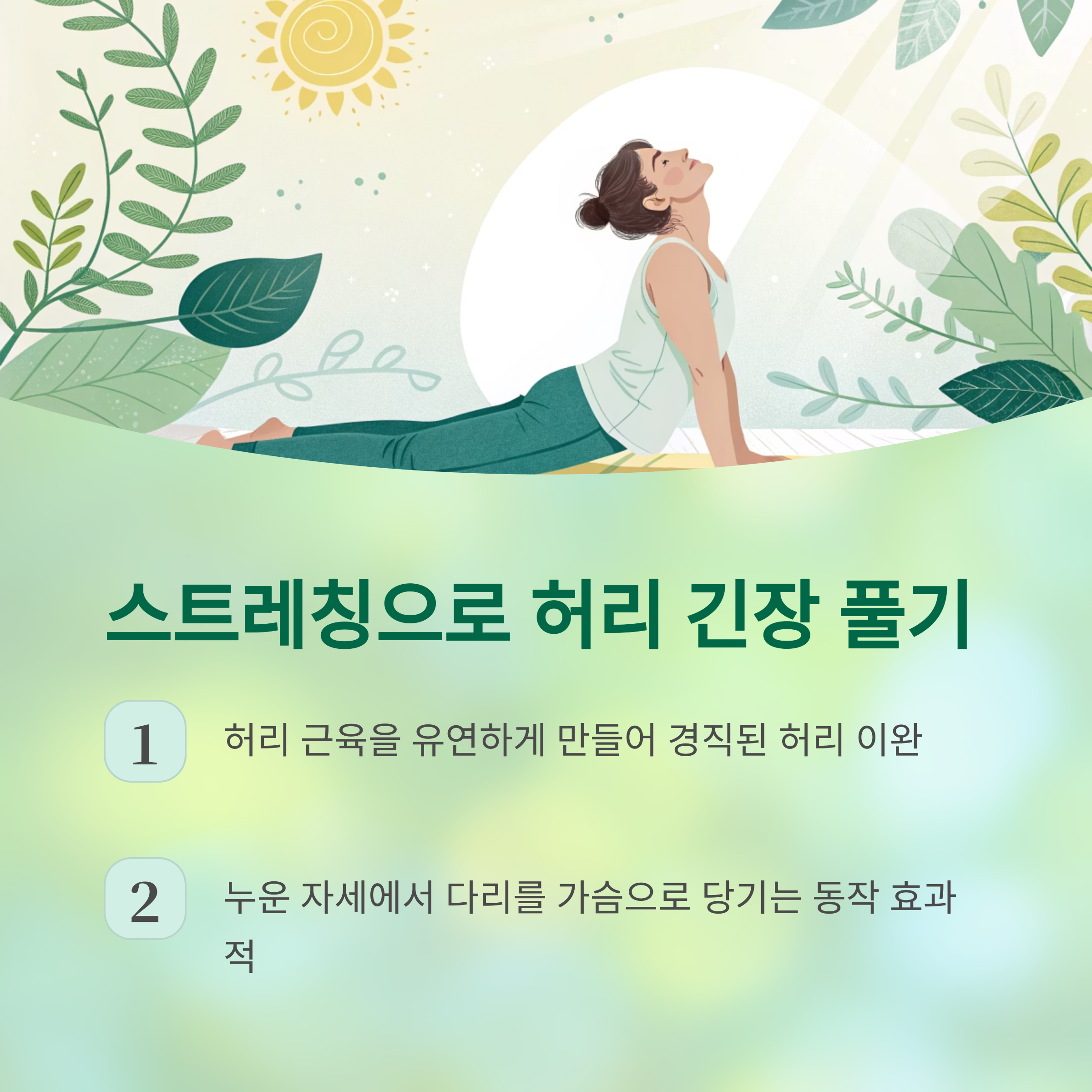 스트레칭은 허리 근육을 유연하게 만들어줍니다 긴장으로 인해 경직된 허리를 부드럽게 이완시켜 통증을 완화하는데 효과적입니다 특히 누운 자세에서 한쪽 다리를 가슴 쪽으로 당기는 스트레칭은 허리 압박을 줄이고 근육 긴장을 풀어줍니다