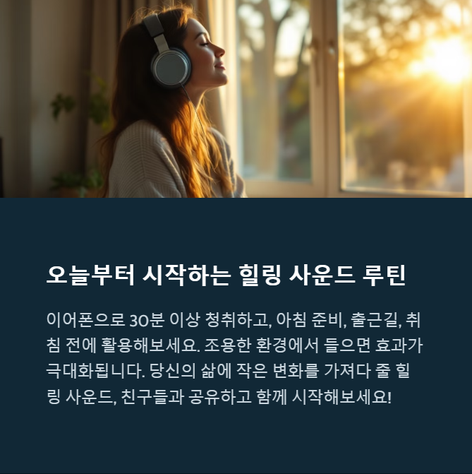 스트레스로 꽉 찼던 몸과 마음이 조금씩, 아주 조금씩 풀리기 시작했어요. 중요한 건, “작은 사운드 하나가 삶을 바꿀 수 있다”는 걸 믿는 거예요. 오늘부터 매일 30분, 나만의 사운드 힐링 루틴을 시작해 보세요. 분명 어제와는 다른 내일을 맞이하게 될 거예요.