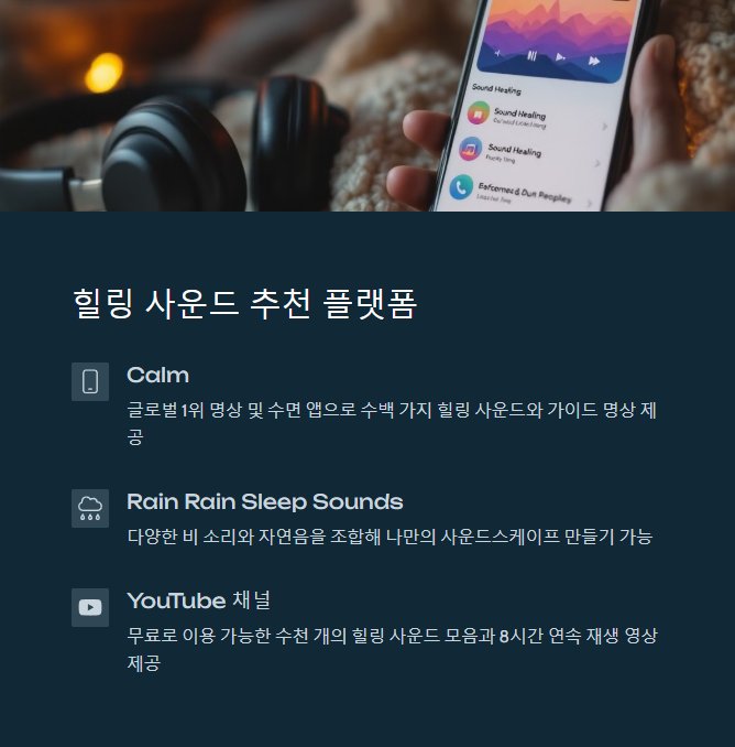 요즘은 굳이 비싼 기기를 사지 않아도 힐링 사운드를 손쉽게 접할 수 있어요. 스마트폰 앱 하나, 유튜브 영상 하나만 있으면 됩니다. 아래는 제가 실제로 써보고 추천하는 리스트예요.