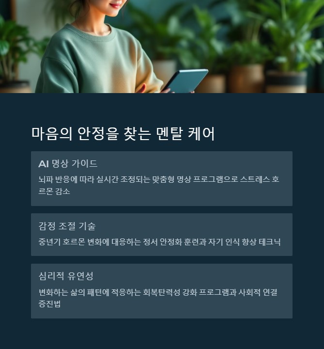 삶의 속도가 빠를수록, 우리 마음은 자주 지쳐요. 2025년 중년 건강 트렌드에서 빠질 수 없는 키워드가 바로 ‘멘털케어’ 예요. 명상 앱, 감정 다이어리, 디지털 세러피까지—지금은 몸만이 아니라 마음도 관리하는 시대죠.