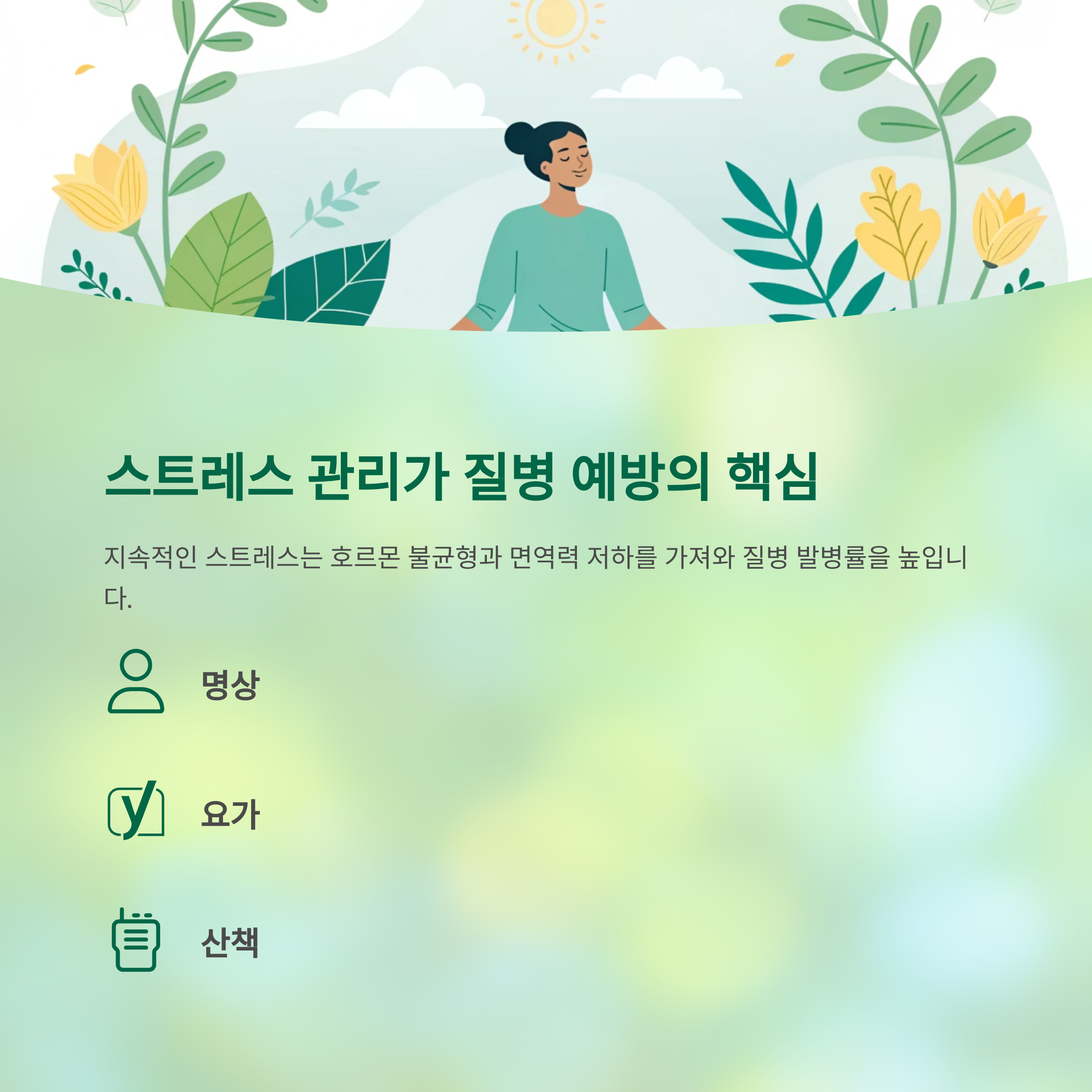 현대인의 주요 질병 중 상당수는 스트레스와 밀접한 관계가 있습니다 특히 지속적인 스트레스는 호르몬 불균형, 면역력 저하를 가져와 질병 발병률을 높입니다 명상, 요가, 산책 등 자신만의 스트레스 해소 방법을 찾고 꾸준히 실천하면 신체적, 정신적 건강을 동시에 관리할 수 있습니다 스트레스를 효과적으로 관리하는 것이 질병 예방의 핵심임을 기억하세요