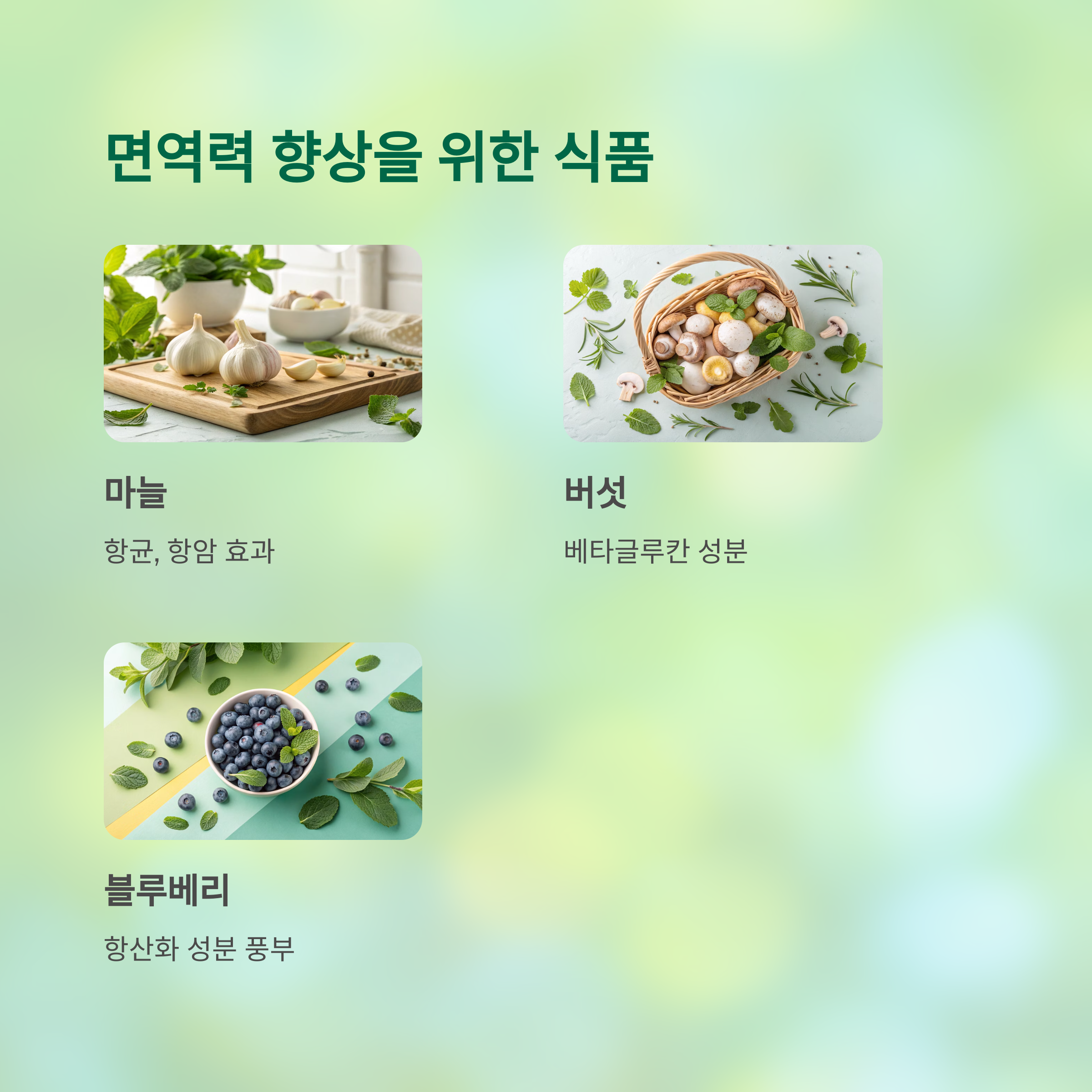 질병 예방을 위해서는 면역력 강화가 필수입니다 면역력 향상에 도움을 주는 대표적인 식품으로는 현미, 마늘, 생강, 버섯, 요구르트, 블루베리, 고구마 등이 있습니다 면역력에 좋은 음식을 꾸준히 섭취하여 몸의 방어력을 높이고 질병에 대비하는 습관을 들이세요