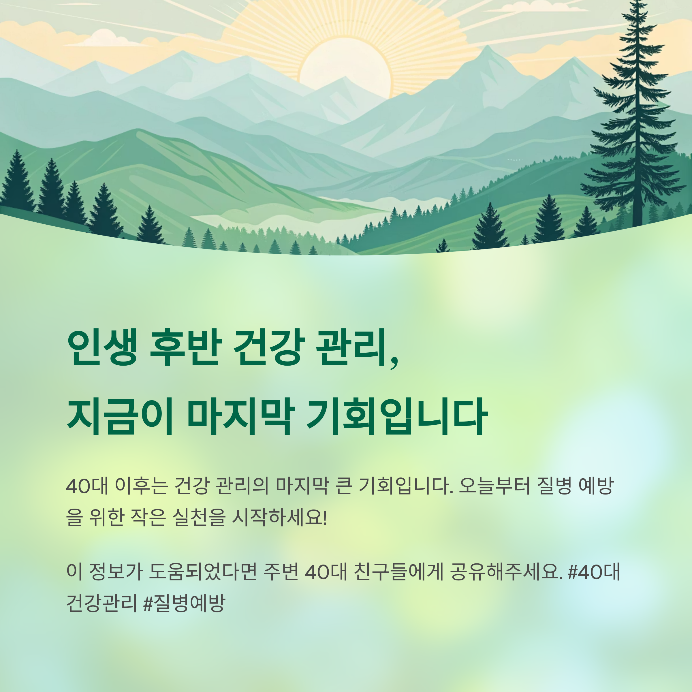건강을 유지하고 질병을 예방하는 데 있어서 골든타임이라는 개념은 너무나도 중요합니다 40대 이후는 건강 관리에 있어 인생의 마지막 큰 기회일 수 있습니다 이때를 놓치지 않고 꾸준히 몸과 마음을 관리하면 건강한 노년기를 맞이할 수 있습니다 늦었다고 생각할 때가 가장 빠를 때입니다 오늘부터라도 질병 예방을 위한 작은 실천을 시작해 보세요