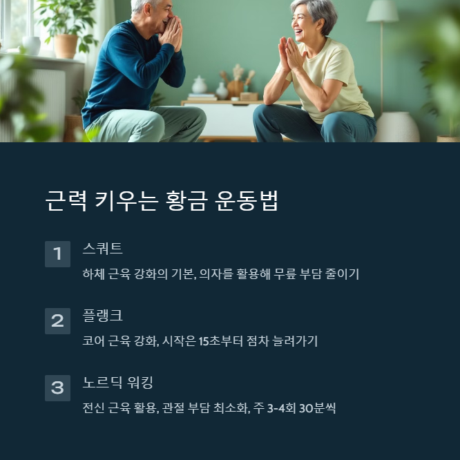 걷기, 저강도 유산소, 스쾃, 플랭크 등 부상 위험이 적고 전신 순환에 좋은 동작부터 시작해 보세요. 짧게 자주가 핵심이에요!