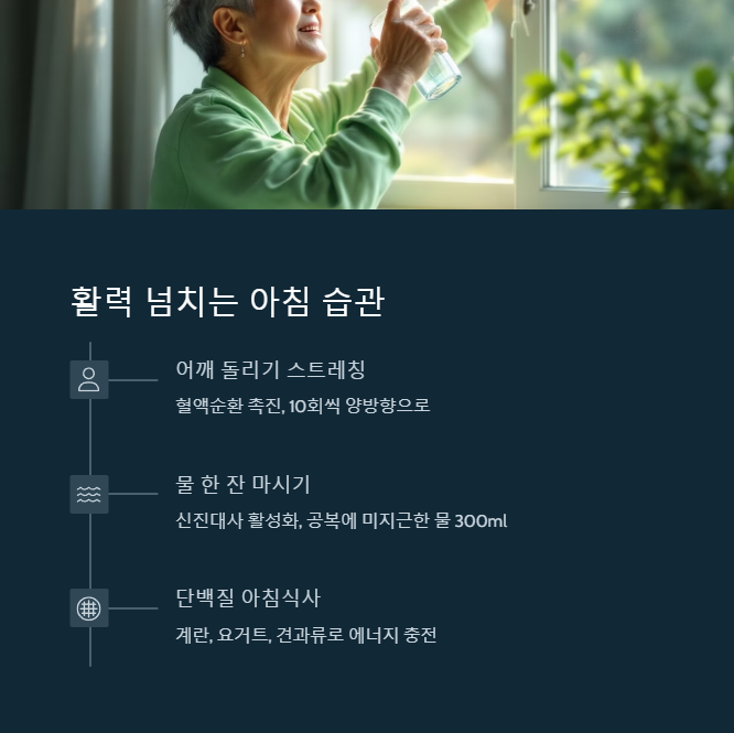 하루의 시작이 어떻게 되느냐에 따라 체력은 물론 기분까지 달라져요. 특히 50대 이후엔 자율신경을 자극하고 혈액순환을 돕는 루틴이 필요해요. 저는 단 3가지 습관만 바꿨는데도 집중력, 기분, 에너지가 놀랍게 달라졌어요. 여러분도 오늘 아침부터 한 번 실천해 보세요!