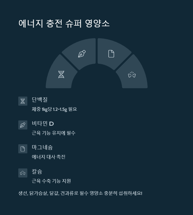 아무리 운동을 해도 영양이 부족하면 무용지물이에요. 특히 에너지 대사와 근육 회복을 도와주는 영양소들은 꼭 챙겨야 해요.