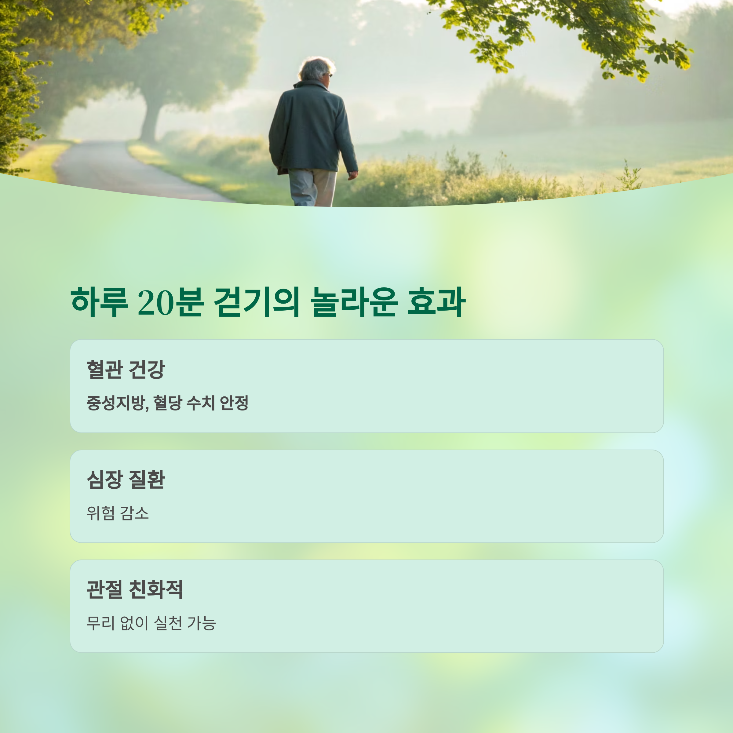하루 20분만 꾸준히 걷는 것만으로도 중성지방, 혈당 수치가 안정되며