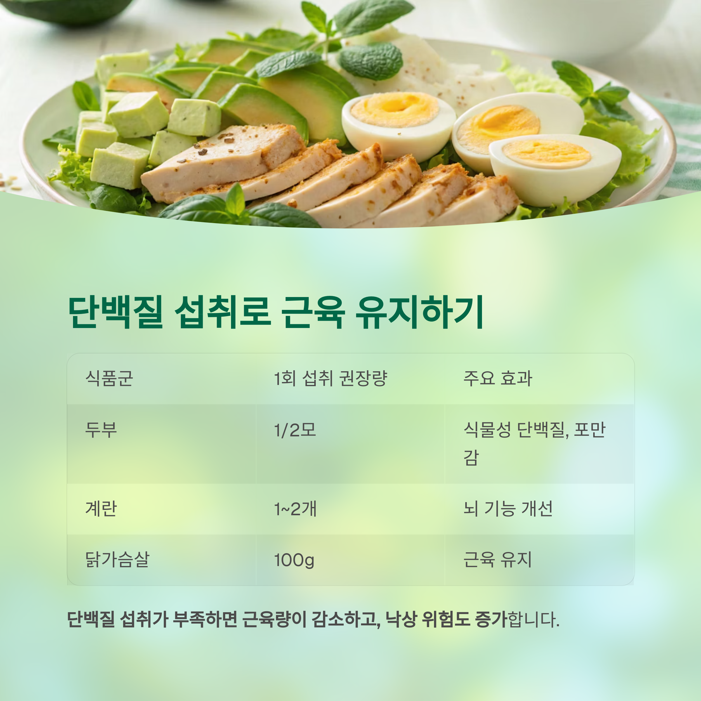 단백질 섭취가 부족하면 근육량이 감소하고, 낙상 위험도 증가합니다.