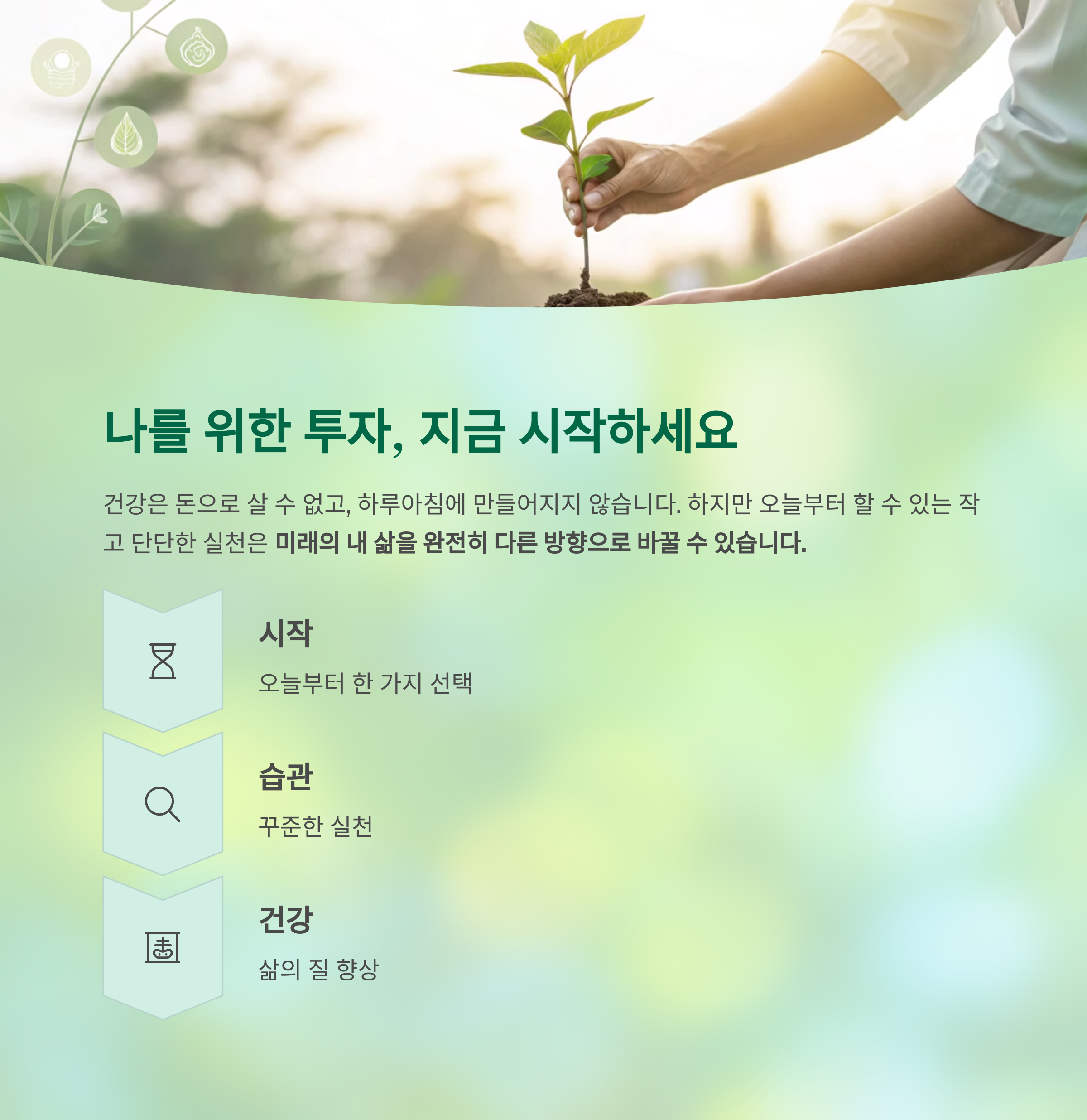 건강은 돈으로 살 수 없고, 하루아침에 만들어지지 않습니다.