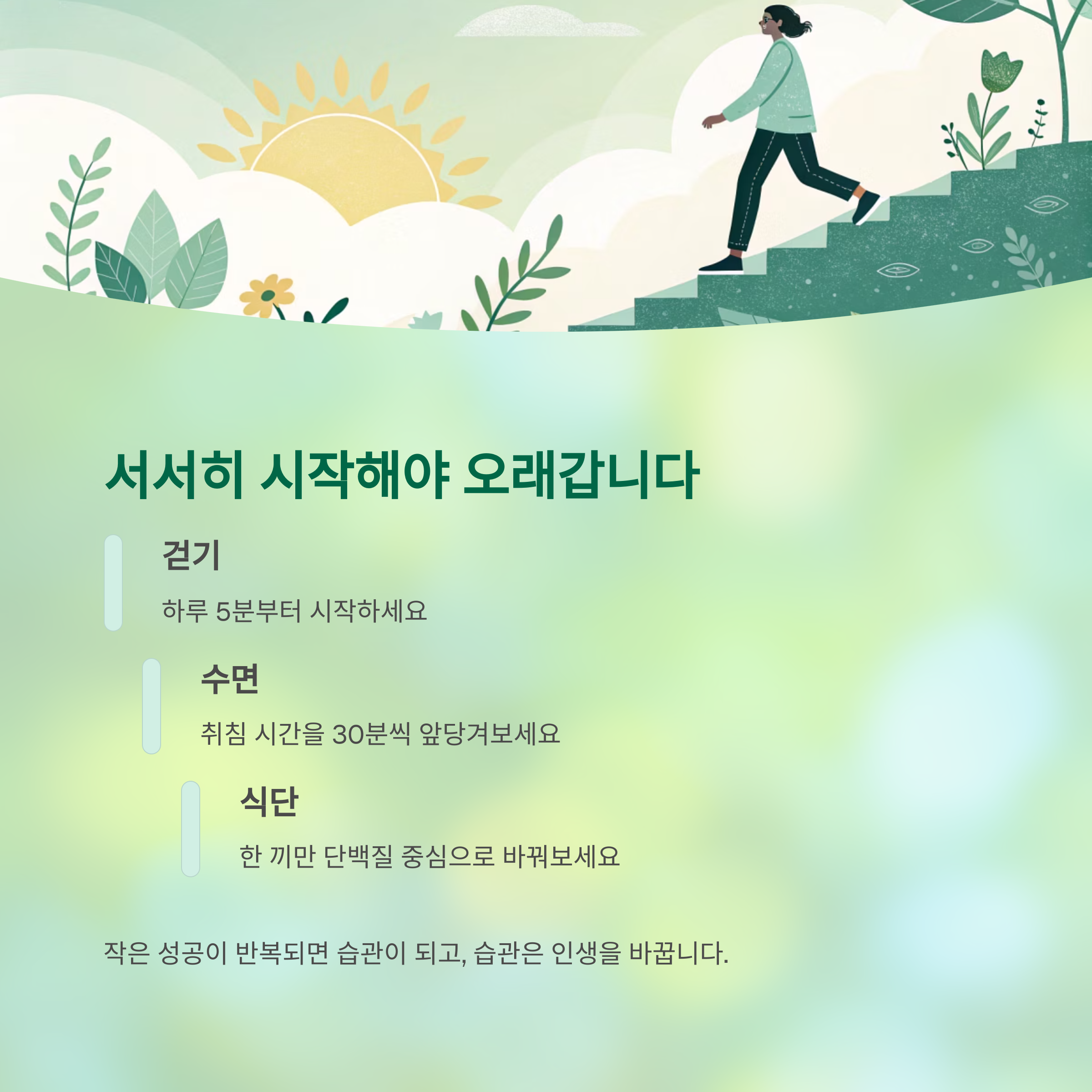 걷기는 5분부터, 수면은 30분씩 앞당기고, 식단은 한 끼만 바꿔보세요.